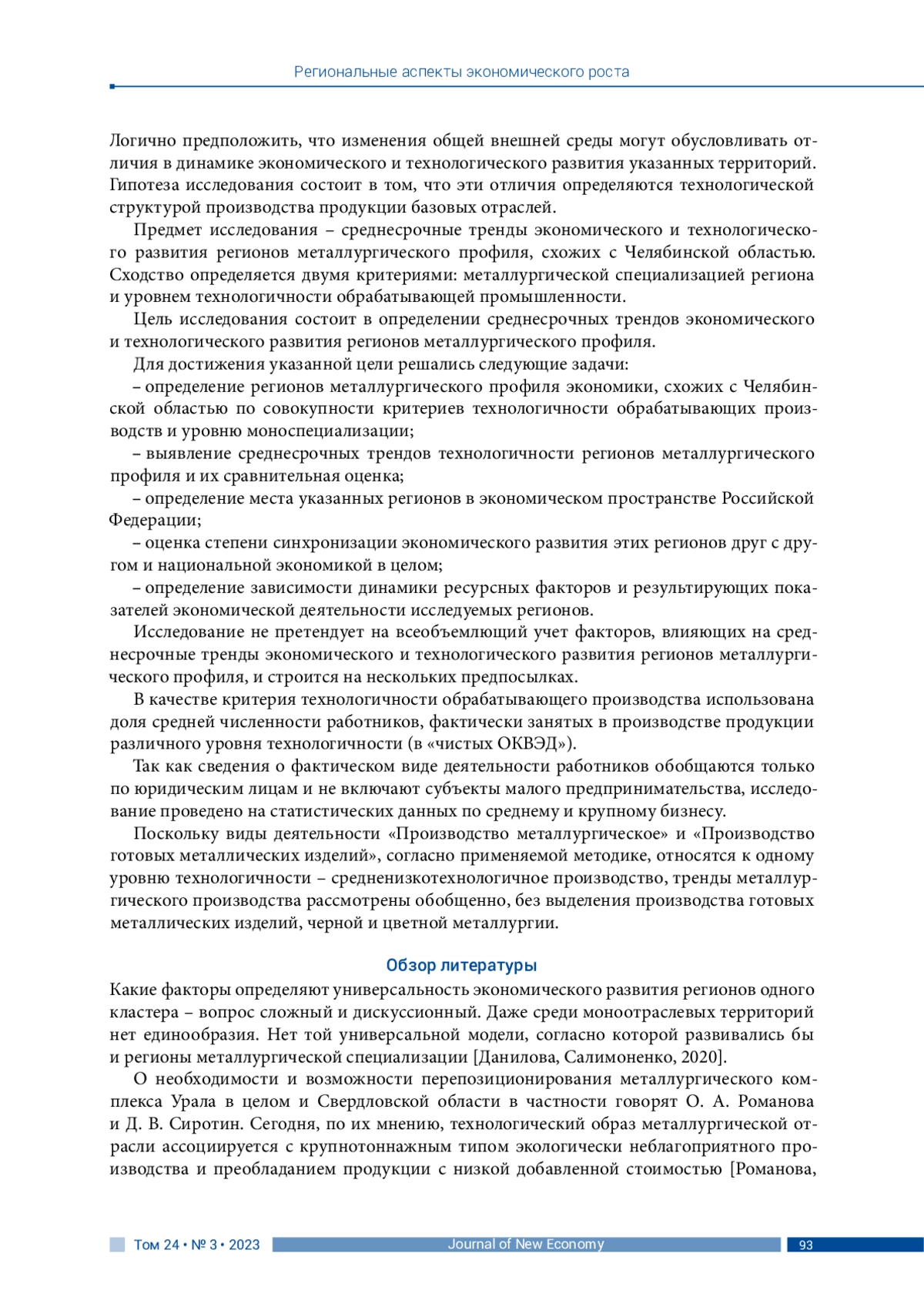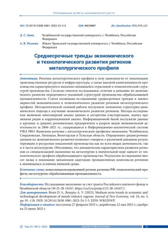 Регионы металлургического профиля в силу зависимости от локализации производственных ресурсов и инфраструктуры, а также высокой капиталоемкости производства характеризуются медленно меняющейся отраслевой и технологической структурой производства. Согласно гипотезе исследования, отличия в динамике их экономического развития определяются указанной структурой производства обрабатывающей промышленности. Статья посвящена исследованию среднесрочных трендов и закономерностей экономического и технологического развития регионов металлургического профиля. Методологической основой работы послужили положения структурно-динамического подхода к изучению экономического развития регионов. Методы исследования включали многомерный анализ данных и алгоритмы кластеризации, оценку временных рядов и корреляционный анализ. Информационной базой послужили данные о крупных и средних региональных предприятиях в разрезе видов экономической деятельности за 2006–2021 гг., содержащиеся в Информационно-аналитической системе FIRA PRO. Выявлены регионы с металлургическим профилем экономики: Челябинская, Свердловская, Липецкая, Вологодская и Тульская области. Определение среднесрочных трендов их экономического развития позволяет говорить о различной динамике результирующих и ресурсных показателей производства как по всем видам деятельности, так и в части металлургии. Обосновано, что динамические характеристики развития регионов со специализацией экономики на металлургии в значительной мере зависят от технологического профиля обрабатывающего производства. Результаты исследования вносят вклад в понимание механизмов адаптации промышленных комплексов регионов к меняющимся условиям внешней среды.