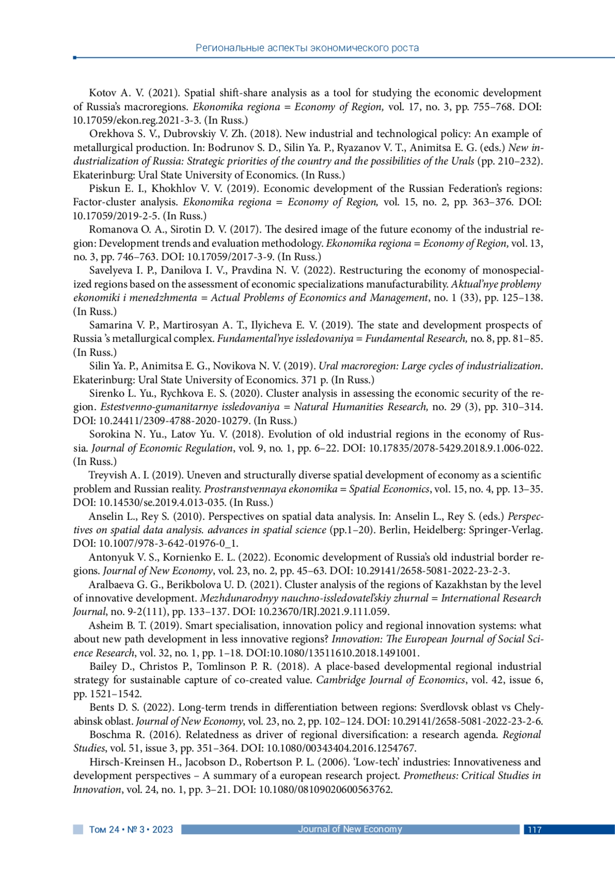 3. Данилова И. В., Правдина Н. В. (2022). Развитие монопрофильных регионов экономического пространства России: сравнительный анализ // Вестник Южно-Уральского государственного университета. Серия “Экономика и менеджмент”. Т. 16, № 2. С. 21-34. DOI: 10.14529/em220202 EDN: CRYRDB
