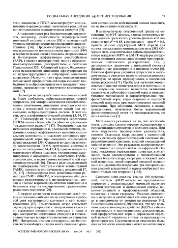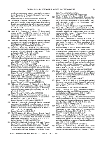 Ангедония, и в частности социальная ангедония – важный психопатологический симптом, играющий ключевую роль в развитии депрессий и шизофрении. У здоровых людей уровень социальной ангедонии ассоциирован с изменением структуры, активации и функциональных связей различных участков префронтальной коры, височной и височно-теменной областей, а также базальных ядер. Для пациентов с шизофренией ключевые фМРТ-корреляты социальной ангедонии локализуются в височной доле. В отношении лиц с депрессией и другими психическими расстройствами полученные результаты недостаточны для обобщения. В отличие от физической ангедонии, социальная не демонстрирует специфичной ассоциации с объемом и активацией прилежащего ядра.