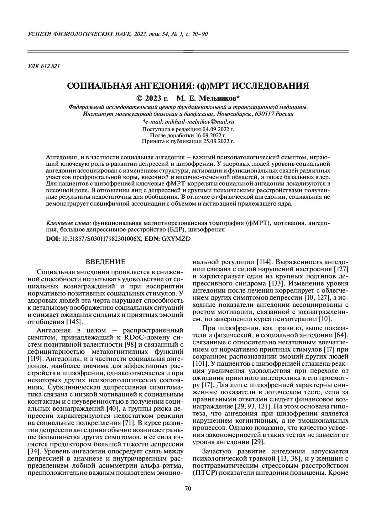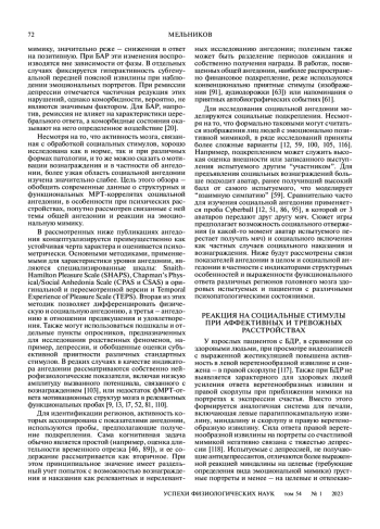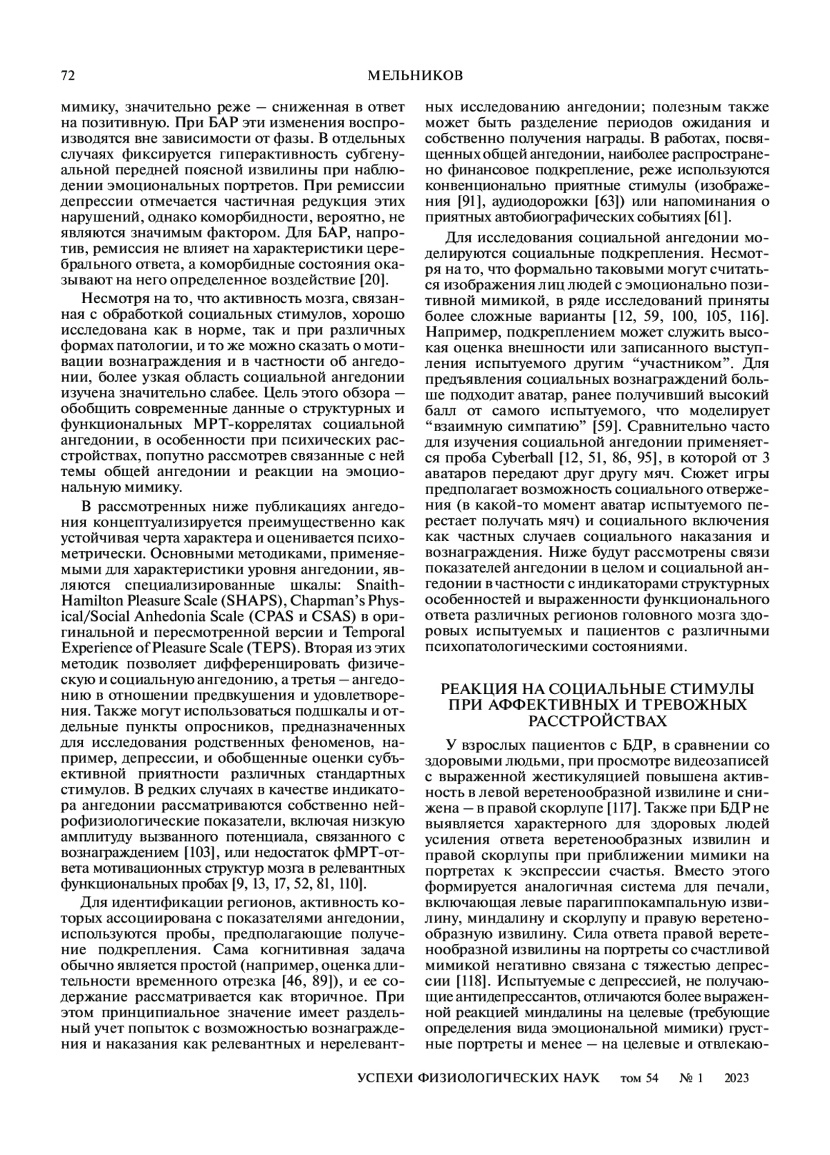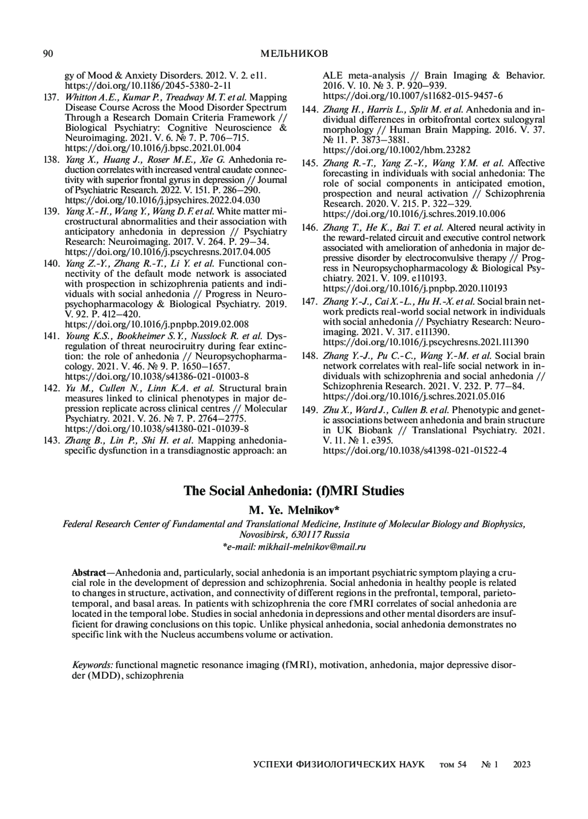 МЕЛЬНИКОВ М. Е. СОЦИАЛЬНАЯ АНГЕДОНИЯ: (Ф)МРТ ИССЛЕДОВАНИЯ // УСПЕХИ ФИЗИОЛОГИЧЕСКИХ НАУК. 2023. Т. 54 № 1 (5 СТ.)