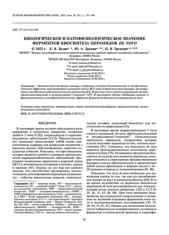 Церамиды – биологически активные липиды с широким спектром биологических и патофизиологических эффектов, выполняющие в жировой ткани (ЖТ) роль вторичного мессенджера, регулирующего метаболический гомеостаз всего организма [83]. Известны 3 пути синтеза церамидов: de novo, сфингомиелиназный и рециркуляции/“спасения” [47]. В настоящем обзоре обобщены данные о физиологических и патофизиологических эффектах ферментов биосинтеза церамидов de novo.