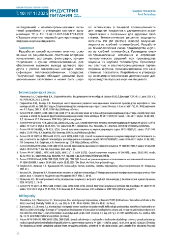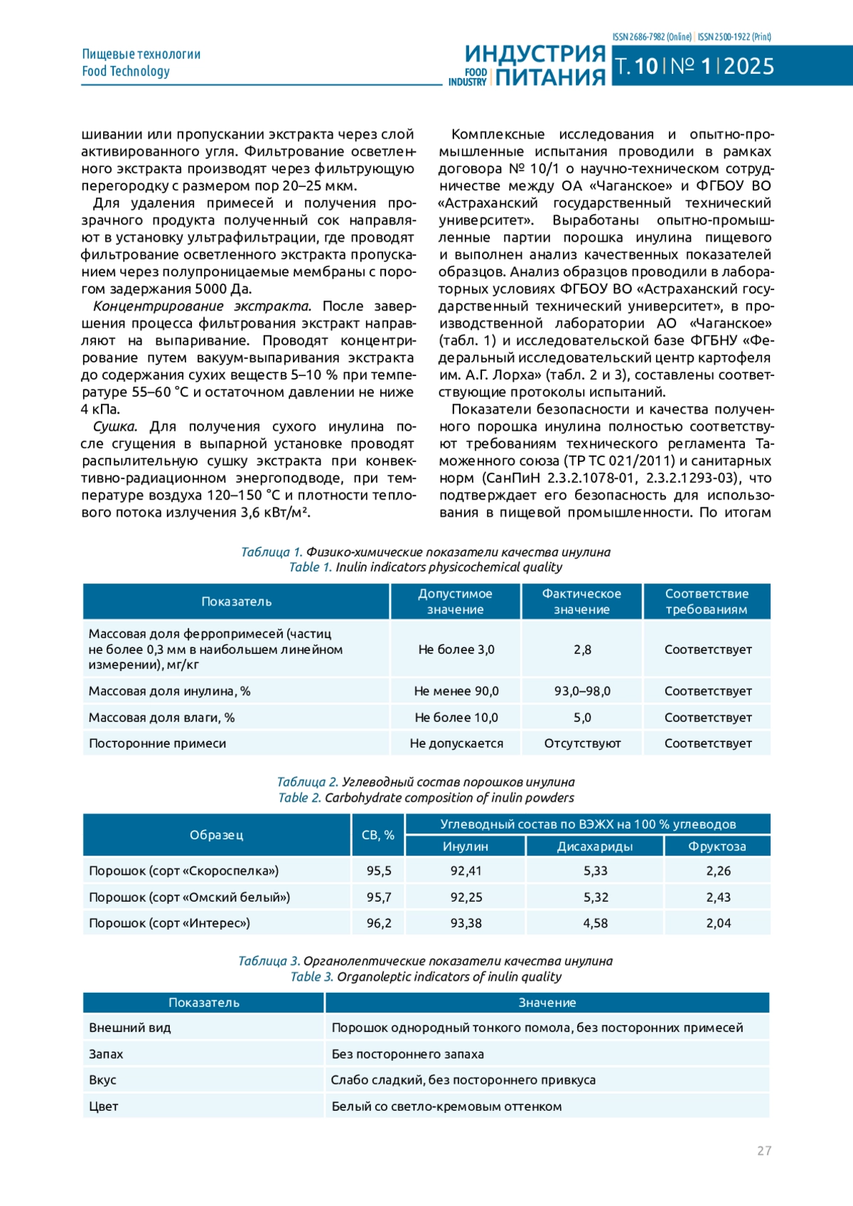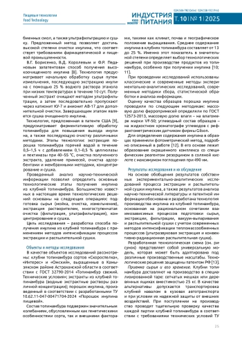 Статья: ТЕХНОЛОГИЯ ПОЛУЧЕНИЯ ИНУЛИНА ИЗ КЛУБНЕЙ ТОПИНАМБУРА (2025)