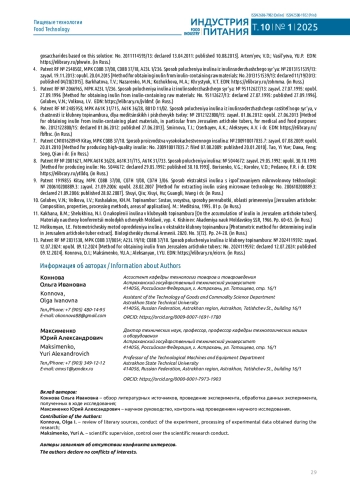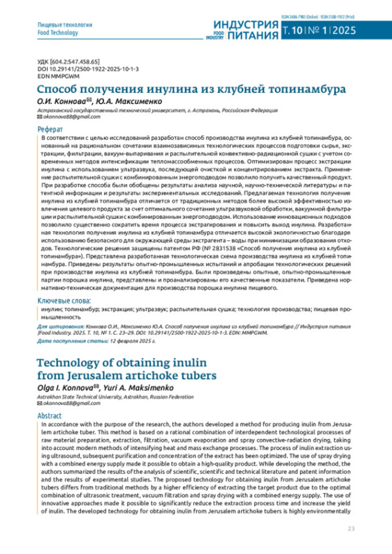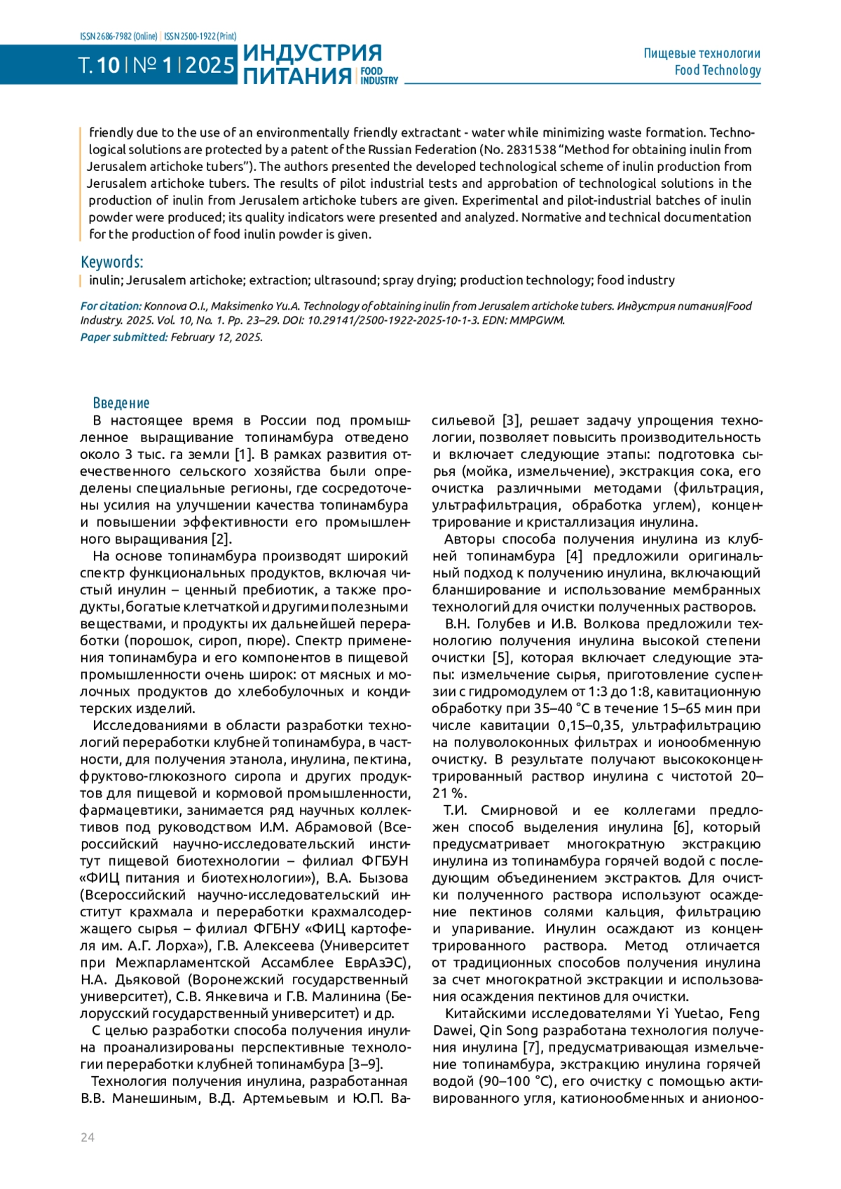 КОННОВА О. И., МАКСИМЕНКО Ю. А. ТЕХНОЛОГИЯ ПОЛУЧЕНИЯ ИНУЛИНА ИЗ КЛУБНЕЙ ТОПИНАМБУРА // ИНДУСТРИЯ ПИТАНИЯ. 2025. Т. 10 № 1