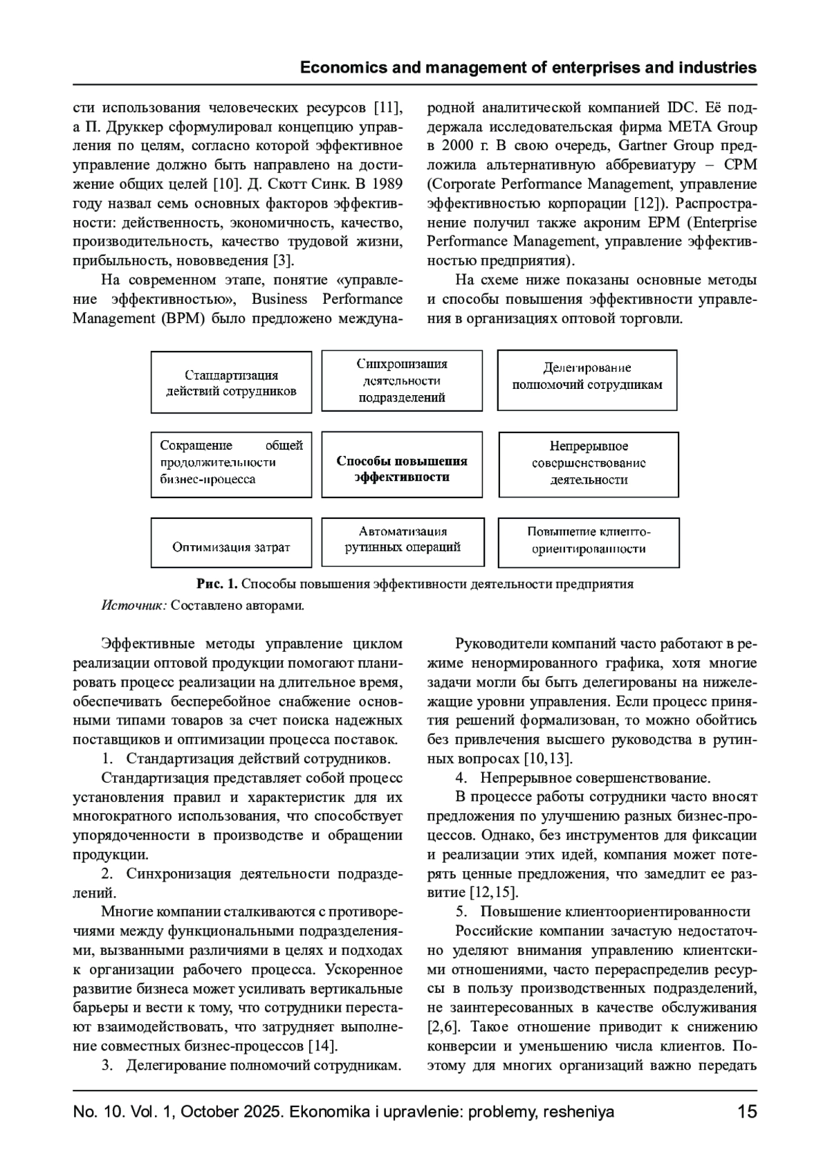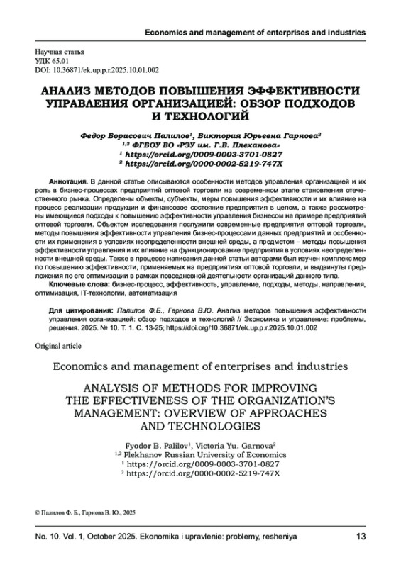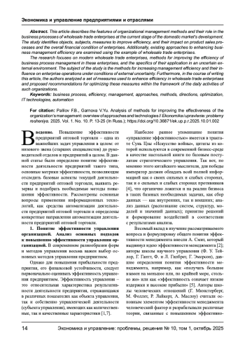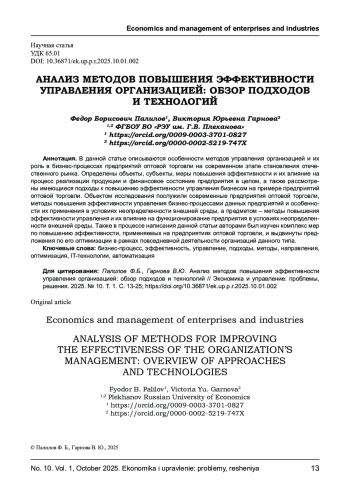 В данной статье описываются особенности методов управления организацией и их роль в бизнес-процессах предприятий оптовой торговли на современном этапе становления отечественного рынка. Определены объекты, субъекты, меры повышения эффективности и их влияние на процесс реализации продукции и финансовое состояние предприятия в целом, а также рассмотрены имеющиеся подходы к повышению эффективности управления бизнесом на примере предприятий оптовой торговли. Объектом исследования послужили современные предприятия оптовой торговли, методы повышения эффективности управления бизнес-процессами данных предприятий и особенности их применения в условиях неопределенности внешней среды, а предметом - методы повышения эффективности управления и их влияние на функционирование предприятия в условиях неопределенности внешней среды. Также в процессе написания данной статьи авторами был изучен комплекс мер по повышению эффективности, применяемых на предприятиях оптовой торговли, и выдвинуты предложения по его оптимизации в рамках повседневной деятельности организаций данного типа.