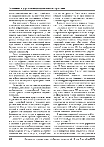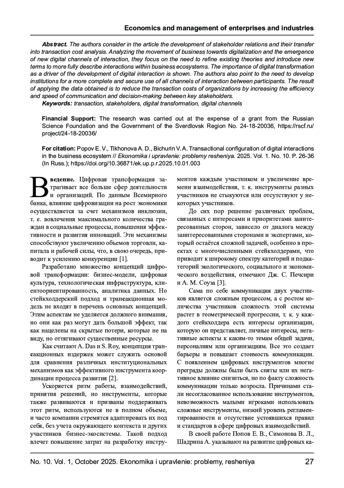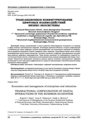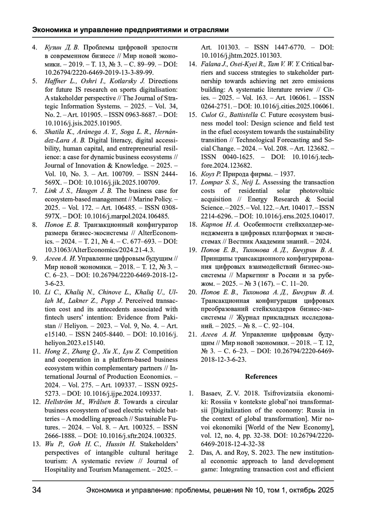 20. Попов Е. В., Тихонова А. Д., Бичурин В. А. Трансакционная конфигурация цифровых преобразований стейкхолдеров бизнес-экосистемы // Журнал прикладных исследований. - 2025. - № 8. - С. 92-104. EDN: IBUEON