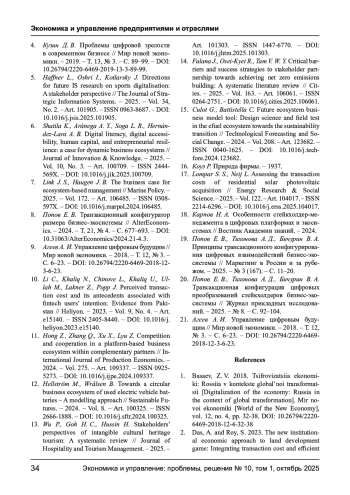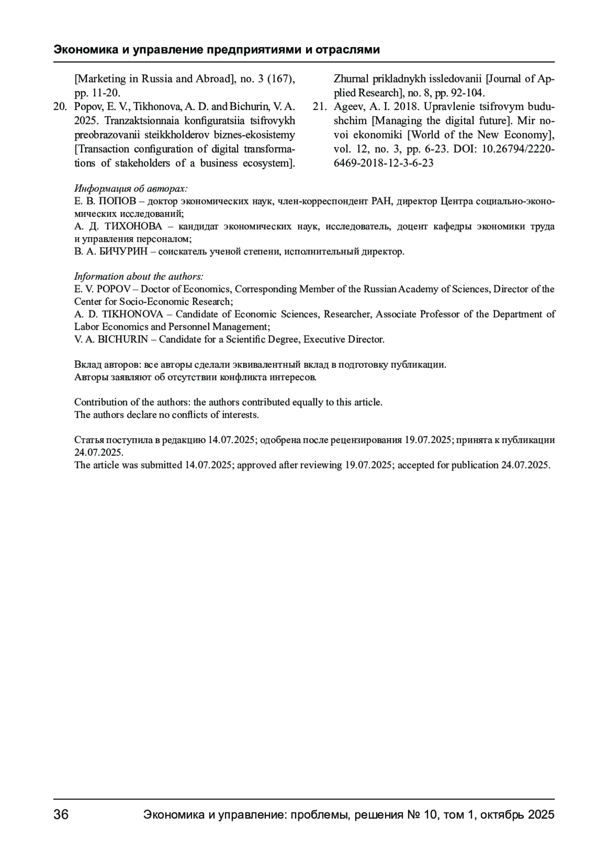 19. Попов Е. В., Тихонова А. Д., Бичурин В. А. Принципы трансакционного конфигурирования цифровых взаимодействий бизнес-экосистемы // Маркетинг в России и за рубежом. - 2025. - № 3 (167). - С. 11-20. EDN: YCFXLQ
