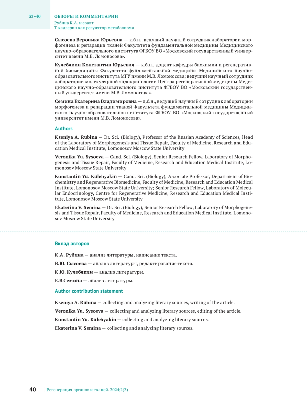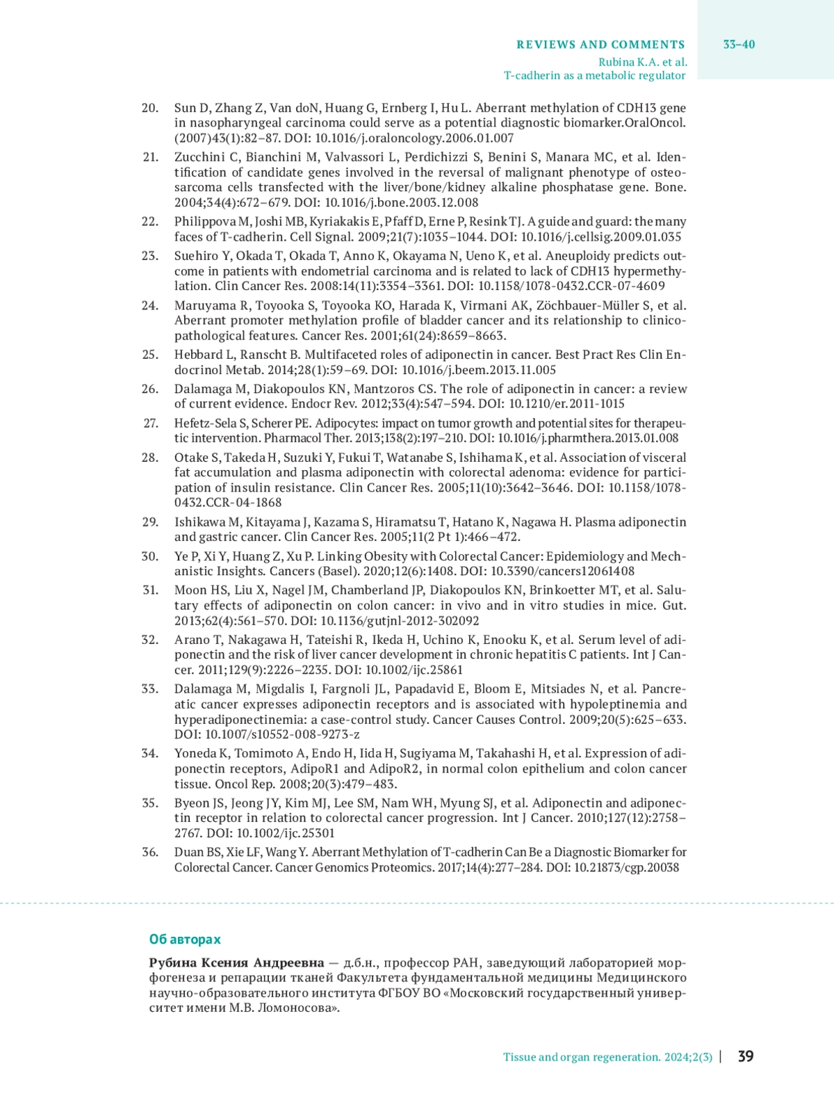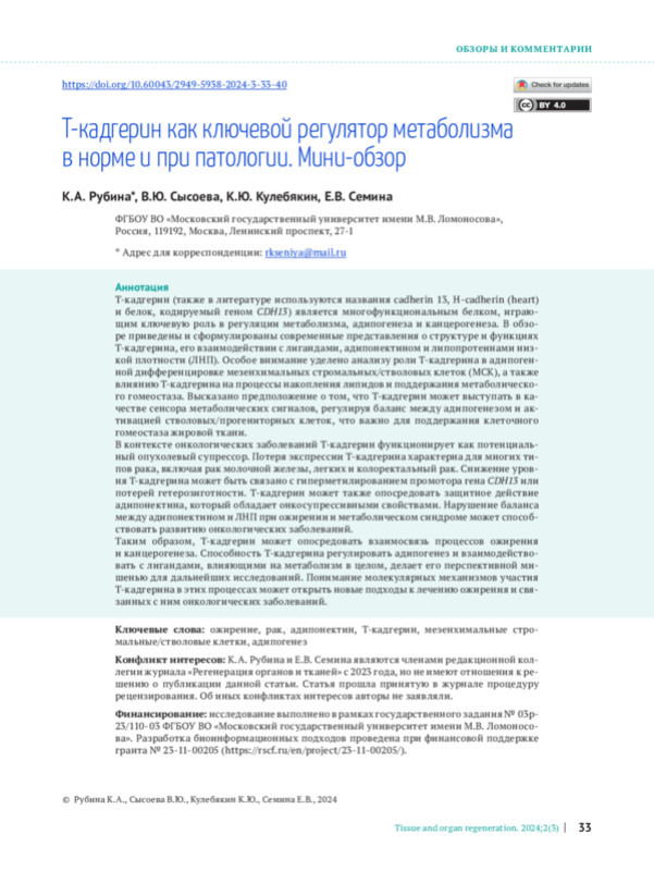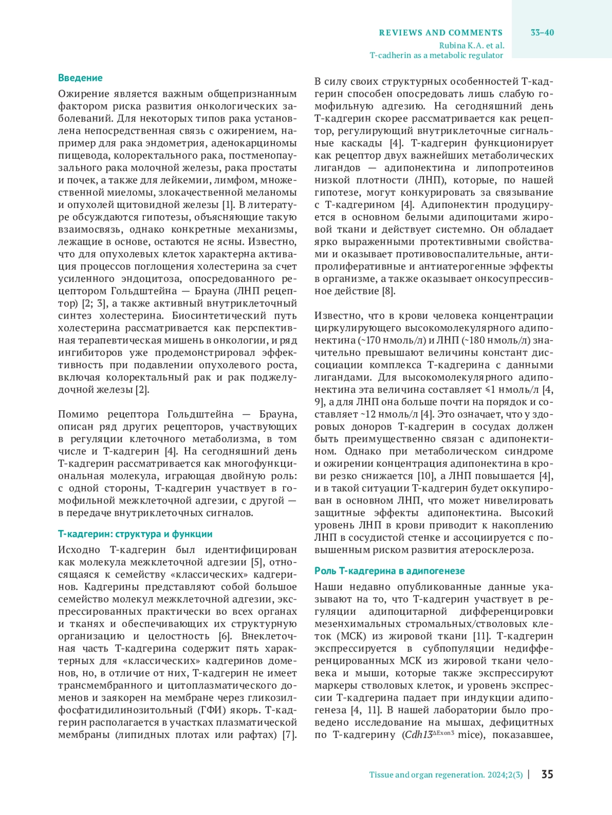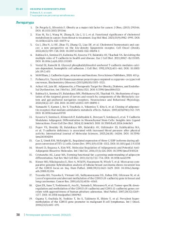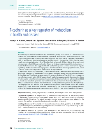 4. Rubina KA, Semina EV, Kalinina NI, Sysoeva VY, Balatskiy AV, Tkachuk VA. Revisiting the multiple roles of T-cadherin in health and disease. Eur J Cell Biol. 2021;100(7-8):151185. DOI: 10.1016/j.ejcb.2021.151185
