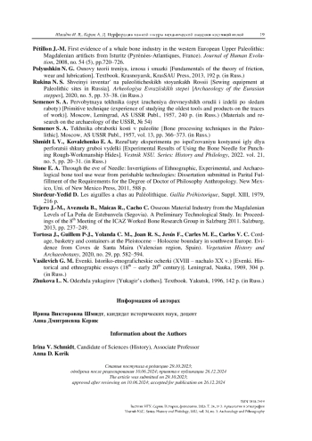 11. Шмидт И. В., Ковальченко Е. А. Результаты эксперимента по использованию костяной иглы для перфорации шкуры грубой выделки // Вестник НГУ. Серия: История, филология. 2022. Т. 21, № 5. С. 20-31.