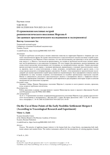 6. Зах В. А. О применении смолистых веществ в практиках раннего неолита в лесостепном Приишимье // Вестник археологии, антропологии и этнографии. 2019. № 4. С. 5-14. https://doi.org/10.20874/2071-0437-2019-47-4-1