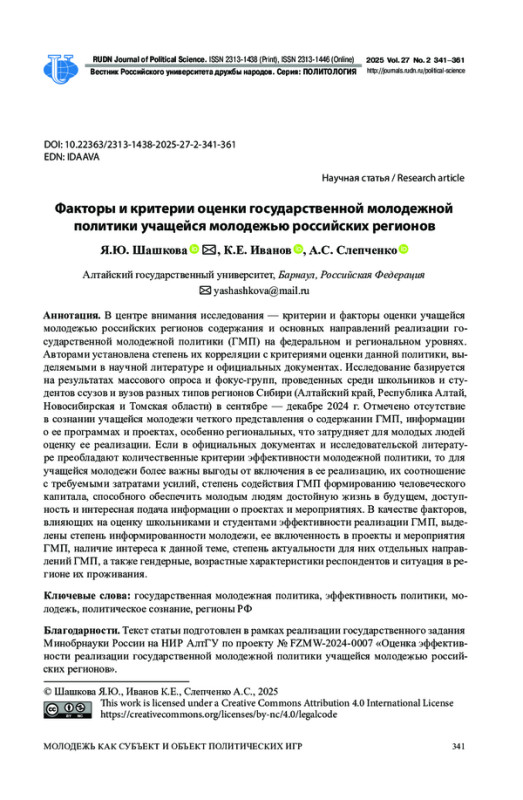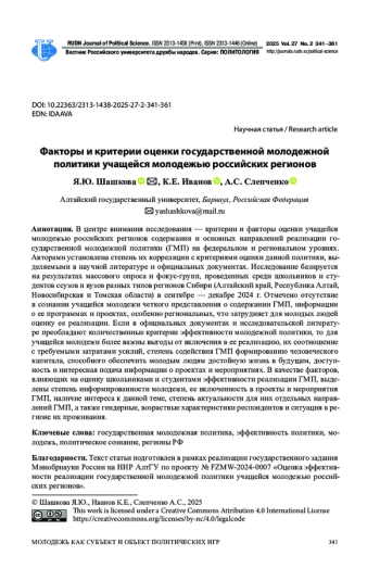 В центре внимания исследования - критерии и факторы оценки учащейся молодежью российских регионов содержания и основных направлений реализации государственной молодежной политики (ГМП) на федеральном и региональном уровнях. Авторами установлена степень их корреляции с критериями оценки данной политики, выделяемыми в научной литературе и официальных документах. Исследование базируется на результатах массового опроса и фокус-групп, проведенных среди школьников и студентов ссузов и вузов разных типов регионов Сибири (Алтайский край, Республика Алтай, Новосибирская и Томская области) в сентябре - декабре 2024 г. Отмечено отсутствие в сознании учащейся молодежи четкого представления о содержании ГМП, информации о ее программах и проектах, особенно региональных, что затрудняет для молодых людей оценку ее реализации. Если в официальных документах и исследовательской литературе преобладают количественные критерии эффективности молодежной политики, то для учащейся молодежи более важны выгоды от включения в ее реализацию, их соотношение с требуемыми затратами усилий, степень содействия ГМП формированию человеческого капитала, способного обеспечить молодым людям достойную жизнь в будущем, доступность и интересная подача информации о проектах и мероприятиях. В качестве факторов, влияющих на оценку школьниками и студентами эффективности реализации ГМП, выделены степень информированности молодежи, ее включенность в проекты и мероприятия ГМП, наличие интереса к данной теме, степень актуальности для них отдельных направлений ГМП, а также гендерные, возрастные характеристики респондентов и ситуация в регионе их проживания.