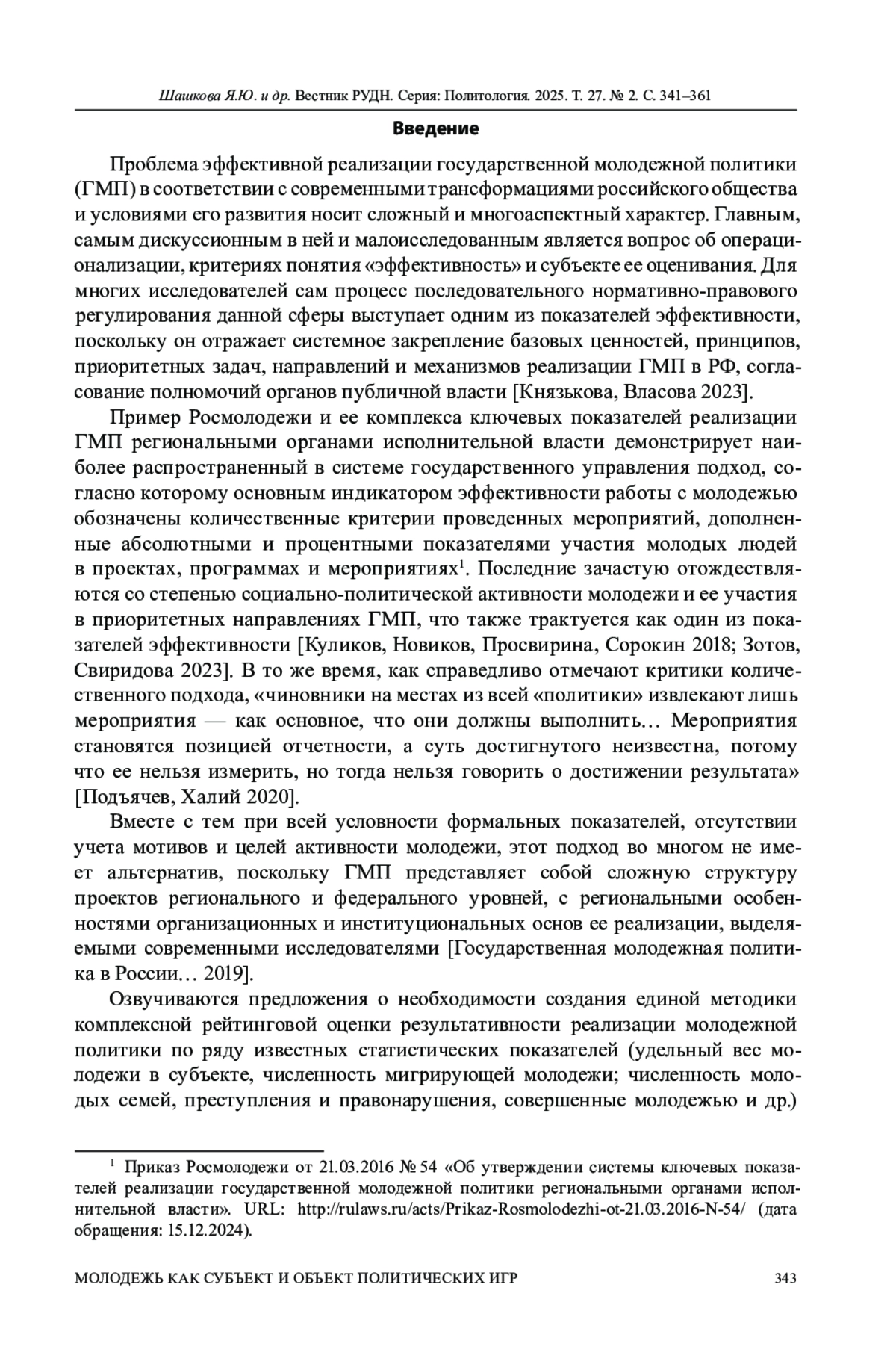 Проблема эффективной реализации государственной молодежной политики (ГМП) в соответствии с современными трансформациями российского общества и условиями его развития носит сложный и многоаспектный характер. Главным, самым дискуссионным в ней и малоисследованным является вопрос об операционализации, критериях понятия «эффективность» и субъекте ее оценивания. Для многих исследователей сам процесс последовательного нормативно- правового регулирования данной сферы выступает одним из показателей эффективности, поскольку он отражает системное закрепление базовых ценностей, принципов, приоритетных задач, направлений и механизмов реализации ГМП в РФ, согласование полномочий органов публичной власти [Князькова, Власова 2023].