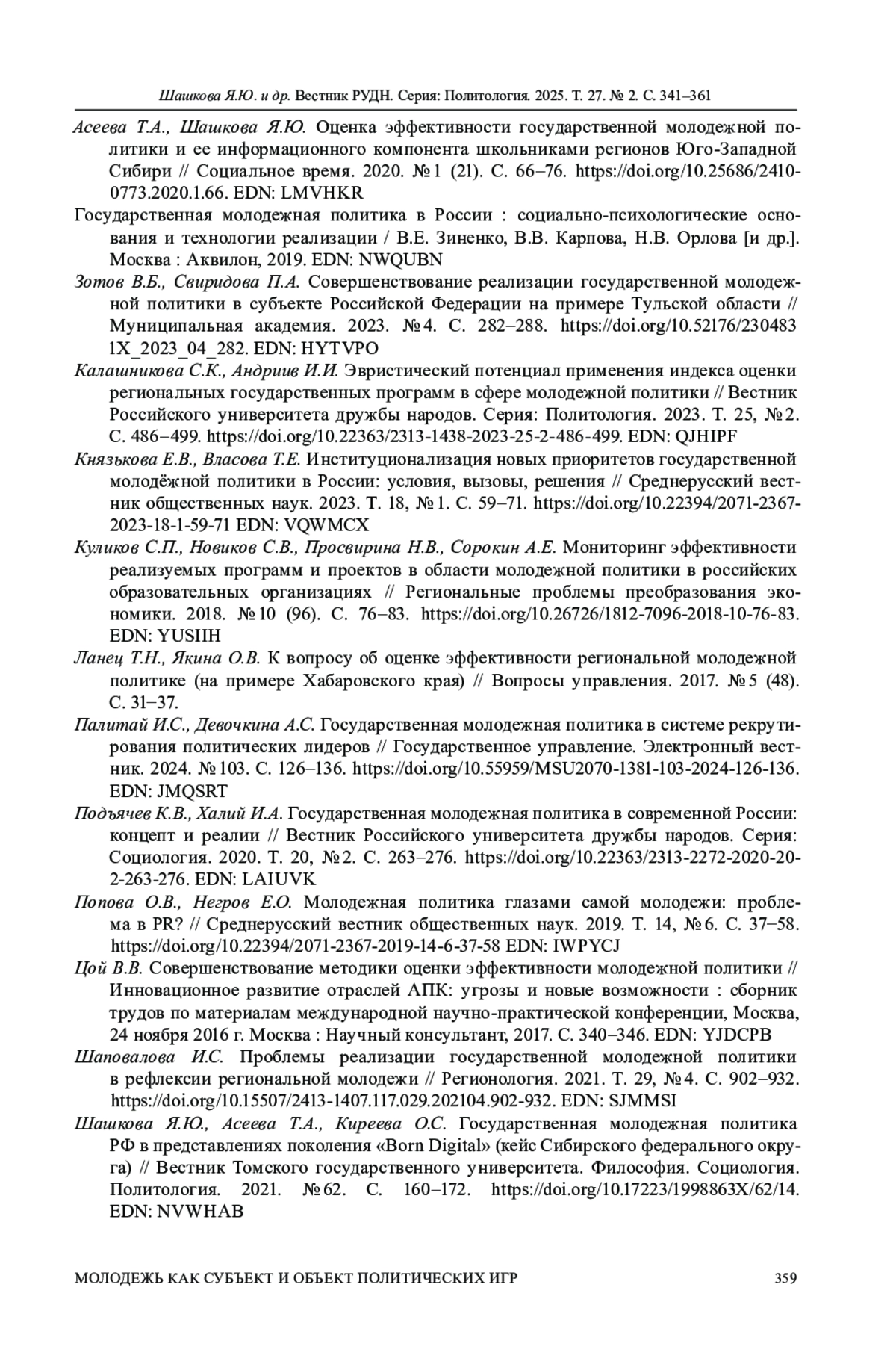 5. Калашникова С.К., Андриив И.И. Эвристический потенциал применения индекса оценки региональных государственных программ в сфере молодежной поли-тики // Вестник Российского университета дружбы народов. Серия: Политология. 2023. Т. 25, № 2. С. 486-499. DOI: 10.22363/2313-1438-2023-25-2-486-499 EDN: QJHIPF