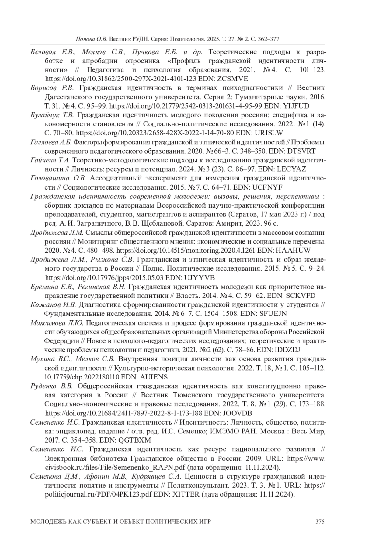 2. Беловол Е.В., Мелков С.В., Пучкова Е.Б. и др. Теоретические подходы к разработке и апробации опросника “Профиль гражданской идентичности личности” // Педагогика и психология образования. 2021. № 4. С. 101-123. DOI: 10.31862/2500-297X-2021-4101-123 EDN: ZCSMVE