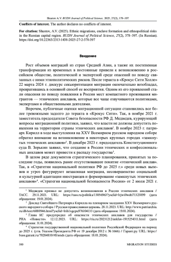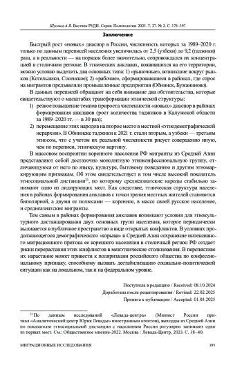 После теракта в «Крокус Сити Холле», совершенного 22 марта 2024 г., иммиграция из азиатских стран СНГ оказалась одной из наиболее острых внешне- и внутриполитических проблем России. Ее значение многократно усиливается теми угрозами безопасности, которые создает использование мигрантов внешними силами в условиях СВО. Нарастание этих угроз породило целый ряд законодательных инициатив по ужесточению миграционной политики и ограничению притока самих мигрантов. Однако возникновение этой проблемы отнюдь не случайно, а теракт в «Крокус Сити» и целый ряд других подобных инцидентов, произошедших в 2024-2025 гг., лишь подчеркнули ее остроту. Не случайно и то, что большинство резонансных событий, связанных с мигрантами, отчетливо локализуется в столичном регионе России, который из-за большой емкости рынка труда является главным объектом их притяжения. Как следствие, вокруг столицы наметилось формирование мест концентрации мигрантов («этнических анклавов»), главным отличием которых от окружающих их территорий является гораздо более высокая численностью иноэтничного и инокультурного населения. Предпринята попытка вывить такие места на основе открытых источников, главным образом - материалов прессы, статистики МВД и переписей населения, а также проанализировать связанные с ними этнополитические риски. Результаты исследования показали, что возникновение анклавов связано с концентрацией трудовых мигрантов на территории локализации их работодателей. Вблизи нее мигранты предпочитают селиться сначала временно, а затем и постоянно. Из-за более высокой рождаемости и продолжающейся иммиграции в таких районах происходит смена национального состава населения, среди которого начинают преобладать доминирующие среди мигрантов этнические группы. Следствием появления анклавов является рост недовольства местного населения, межнациональной напряженности и увеличение числа конфликтных ситуаций, что приводит к нарастанию рисков дестабилизации этнополитической ситуации. Положение усугубляется продолжающимся в странах Центральной (Средней) Азии демографическим взрывом и узостью национальных рынков труда, что вынуждает их коренное население искать работу за рубежом, главным образом - в России и ее столичном регионе.