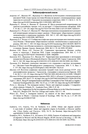 1. Андреева А.С., Иванова Н.С., Варшавер Е.А. Являются ли Котельники этномиграционным анклавом? Кейс-стади города-спутника Москвы на предмет этномиграционных характеристик его жителей // Городские исследования и практики. 2020. Т. 5. № 52. С. 54-72. DOI: 10.14515/monitoring.2021.5.1939 EDN: MPVWAX