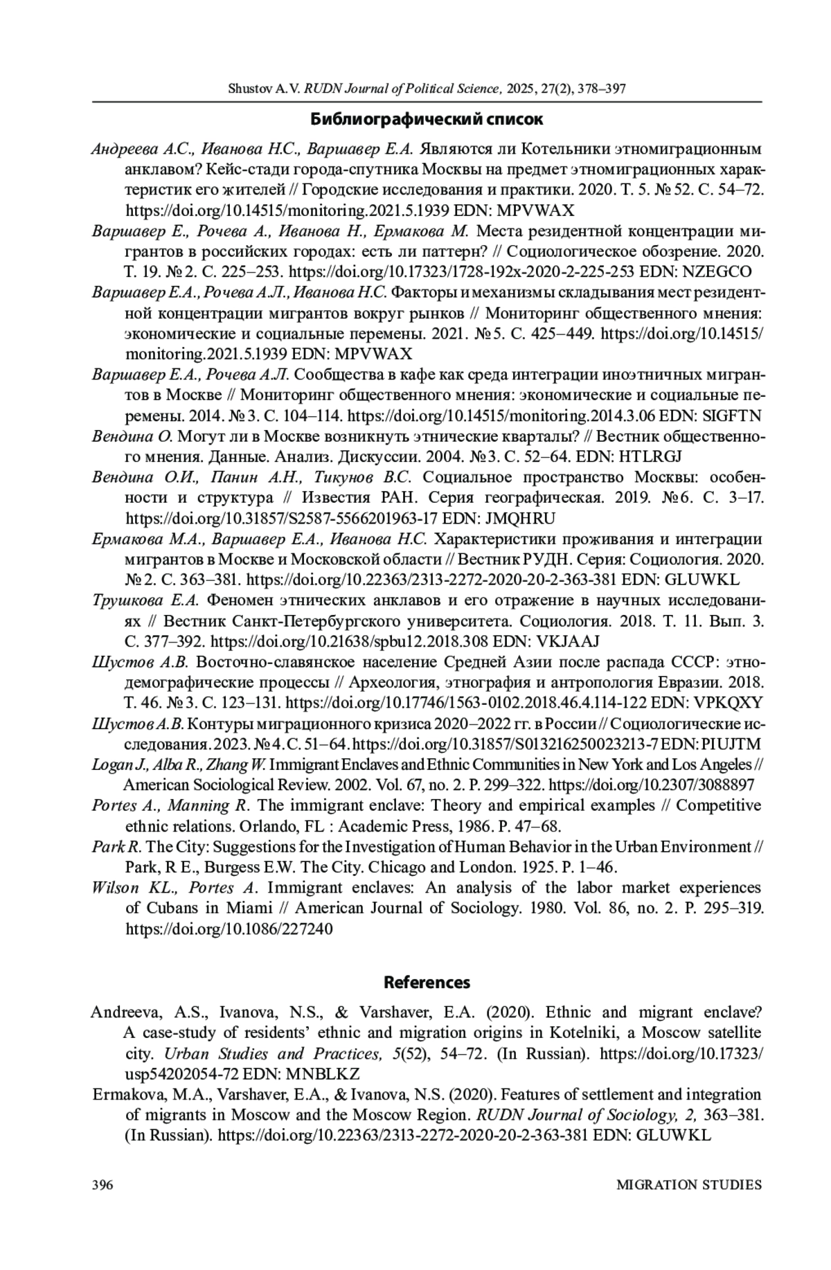 2. Варшавер Е., Рочева А., Иванова Н., Ермакова М. Места резидентной концентрации мигрантов в российских городах: есть ли паттерн? // Социологическое обозрение. 2020. Т. 19. № 2. С. 225-253. DOI: 10.17323/1728-192x-2020-2-225-253 EDN: NZEGCO