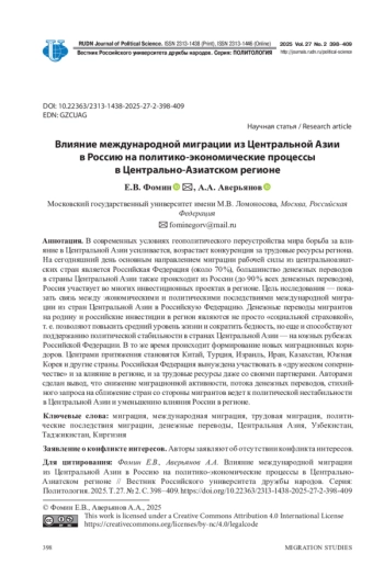 В современных условиях геополитического переустройства мира борьба за влияние в Центральной Азии усиливается, возрастает конкуренция за трудовые ресурсы региона. На сегодняшний день основным направлением миграции рабочей силы из центральноазиатских стран является Российская Федерация (около 70 %), большинство денежных переводов в страны Центральной Азии также происходит из России (до 90 % всех денежных переводов), Россия участвует во многих инвестиционных проектах в регионе. Цель исследования - показать связь между экономическими и политическими последствиями международной миграции из стран Центральной Азии в Российскую Федерацию. Денежные переводы мигрантов на родину и российские инвестиции в регион являются не просто «социальной страховкой», т. е. позволяют повысить средний уровень жизни и сократить бедность, но еще и способствуют поддержанию политической стабильности в странах Центральной Азии - на южных рубежах Российской Федерации. В то же время происходит формирование новых миграционных коридоров. Центрами притяжения становятся Китай, Турция, Израиль, Иран, Казахстан, Южная Корея и другие страны. Российская Федерация вынуждена участвовать в «дружеском соперничестве» и за влияние в регионе, и за трудовые ресурсы даже со своими партнерами. Авторами сделан вывод, что снижение миграционной активности, потока денежных переводов, стихийного запроса на сближение стран со стороны мигрантов ведет к политической нестабильности в Центральной Азии и уменьшению влияния России в регионе.