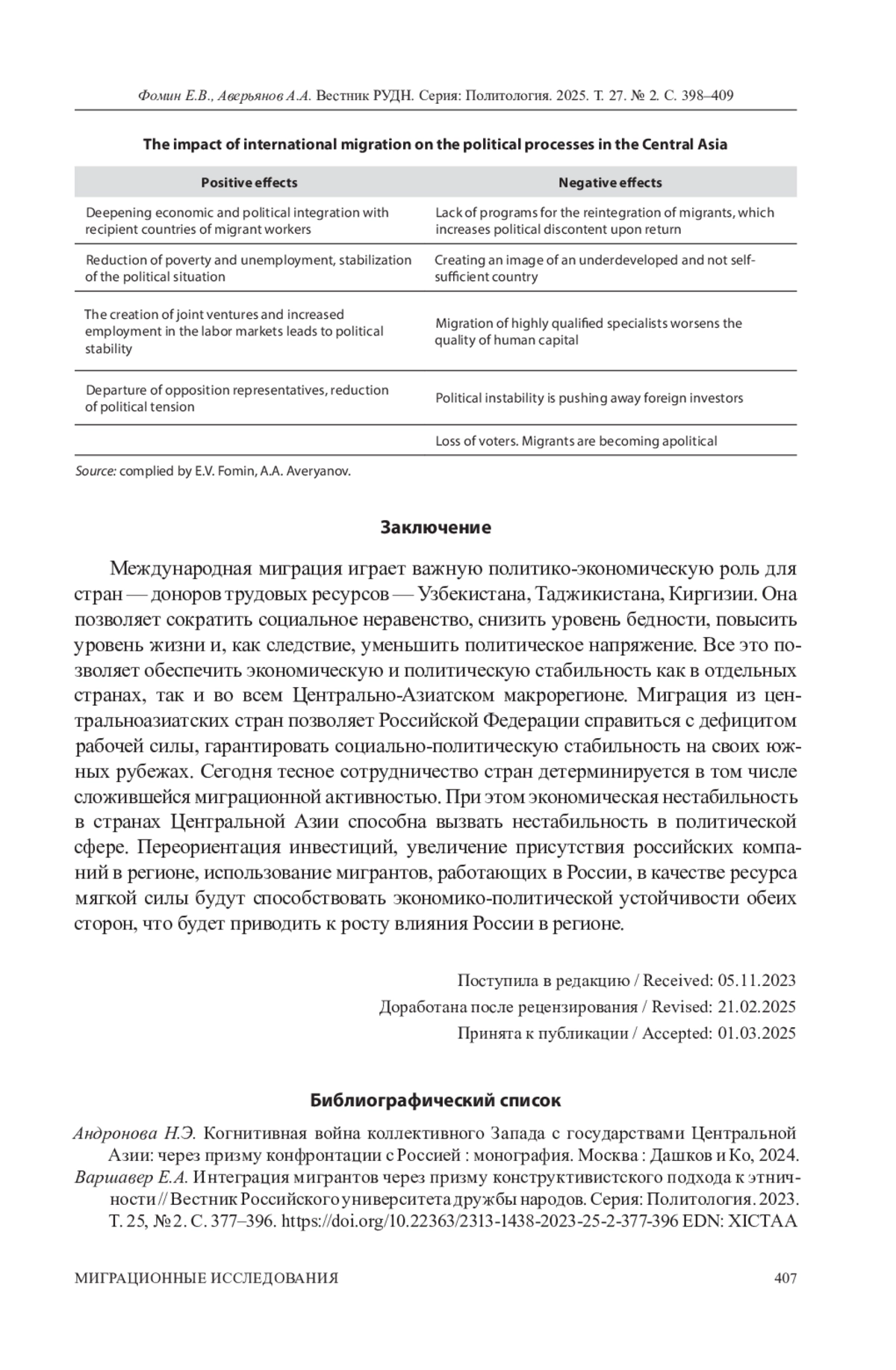 2. Варшавер Е.А. Интеграция мигрантов через призму конструктивистского подхода к этничности // Вестник Российского университета дружбы народов. Серия: Политология. 2023. Т. 25, № 2. С. 377-396. DOI: 10.22363/2313-1438-2023-25-2-377-396 EDN: XICTAA
