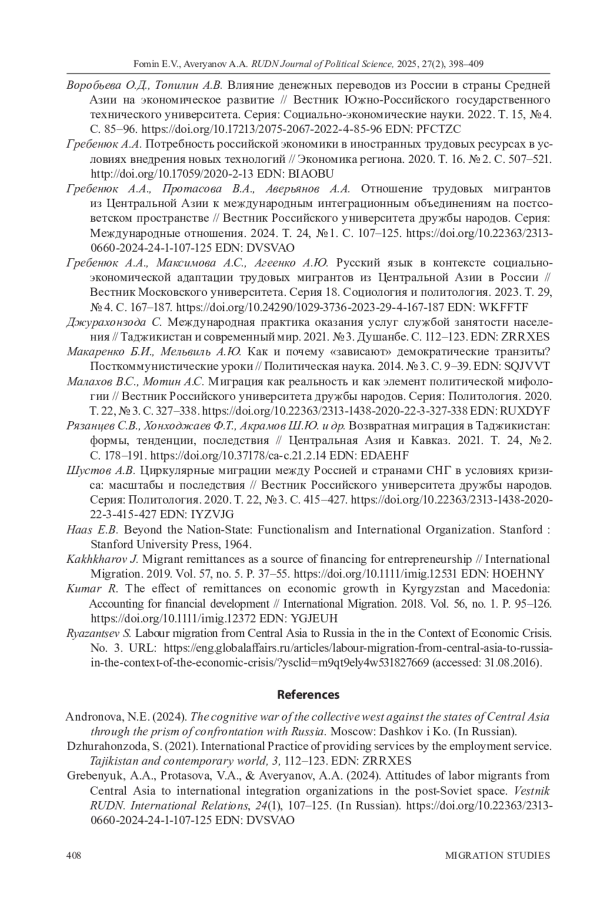 5. Гребенюк А.А., Протасова В.А., Аверьянов А.А. Отношение трудовых мигрантов из Центральной Азии к международным интеграционным объединениям на постсоветском пространстве // Вестник Российского университета дружбы народов. Серия: Международные отношения. 2024. Т. 24, № 1. С. 107-125. DOI: 10.22363/2313-0660-2024-24-1-107-125 EDN: DVSVAO