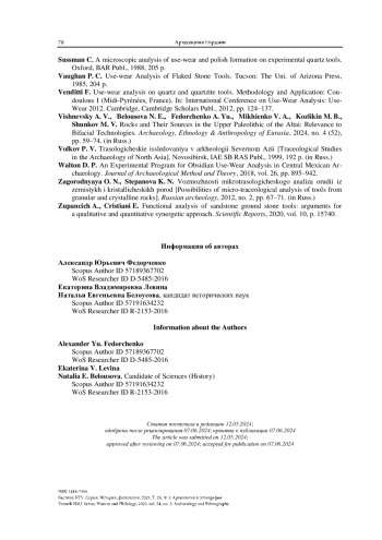 13. Левина Е. В., Федорченко А. Ю. Сравнение особенностей формообразования макро- и микроследов на поверхности орудий из разного минерального сырья // Новые материалы и методы археологического исследования: история vs источниковедение: Материалы VII Конференции молодых ученых. М.: ИА РАН, 2023. С. 26-28.