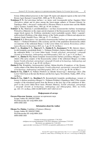 10. Зах В. А., Зимина О. Ю. Ранний комплекс красноозерской культуры поселения Мергень 2 в Приишимье // Вестник археологии, антропологии и этнографии. 2014. № 4 (27). С. 48-59.