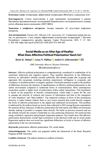 Аффективная политическая поляризация комплексно рассматривается в сочетании ее эмоциональных, поведенческих и когнитивных аспектов. Все они проявляются в различиях между отношением индивида к политическим единомышленникам (ингруппе) и оппонентам (аутгруппе): в испытываемых эмоциях, готовности к сотрудничеству, склонности приписывать положительные или отрицательные качества. Особое внимание уделено проблеме различий между интенсивностью проявлений аффективной политической поляризации в онлайн-среде по сравнению с традиционными формами коммуникации. Большинство современных исследователей склоняются к гипотезе о более высоком уровне поляризации в рамках онлайн-взаимодействий. Данная гипотеза опирается на свойства интернет-общения, которые облегчают пользователю управление сетью контактов и источников информации и порождают феномены «эхо-камер» и «пузырей фильтров». Последние способствуют психологическому восприятию точки зрения единомышленников как единственно «нормальной» и увеличению эмоциональной дистанции по отношению к политическим оппонентам. При этом эмпирические свидетельства в пользу этого механизма довольно ограничены; крайне мало исследований, которые ставили бы задачу прямого сравнения аффективной поляризации в цифровой и традиционной средах. Эта задача решается авторами на основе опросных данных, собранных в 2025 г. среди российских респондентов. Все ключевые индикаторы аффективной поляризации измеряются для двух ситуаций - онлайн и офлайн, что обеспечивает возможность их непосредственного сопоставления. С опорой на предыдущие исследования в качестве ключевого поляризующего признака рассматривается отношение к руководству страны. Данные проанализированы с помощью корреляционного и регрессионного анализа, а также методом главных компонент. Анализ показывает, что аффективная поляризация демонстрирует в целом высокую согласованность в физическом мире и в социальных сетях. Результаты регрессии не позволяют выявить существенные расхождения в уровнях и факторах, влияющих на аффективную поляризацию, в двух средах.
