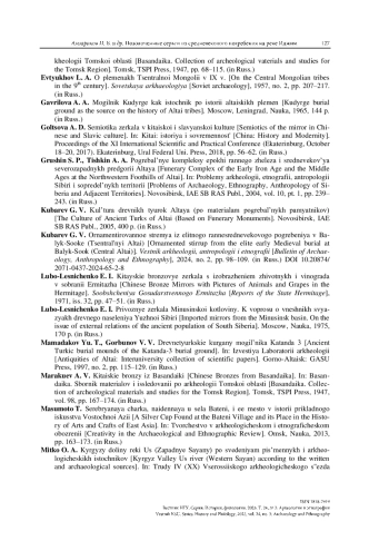 24. Митько О. А. Погребения элитных кыргызских воинов в Усинской долине // Современные решения актуальных проблем евразийской археологии. Барнаул: Изд-во АлтГУ, 2013. С. 206-209.