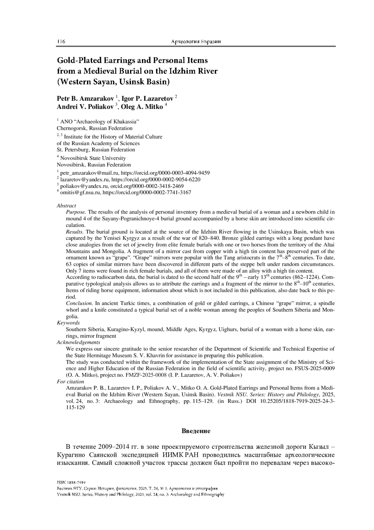 4. Амзараков П. Б., Лазаретов И. П., Митько О. А., Поляков А. В. Этнокультурная принадлежность средневекового захоронения со шкурой коня в долине реки Иджим в Западном Саяне // Вестник НГУ. Серия: История, филология. 2015а. Т. 14, № 7: Археология и этнография. С. 151-164.