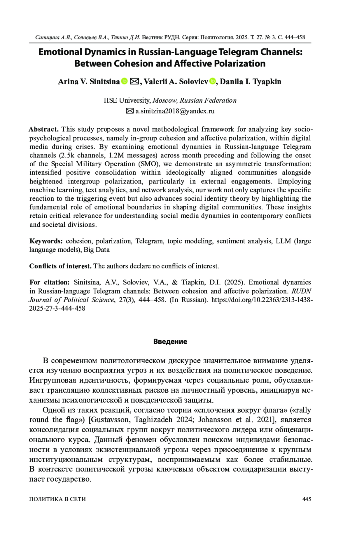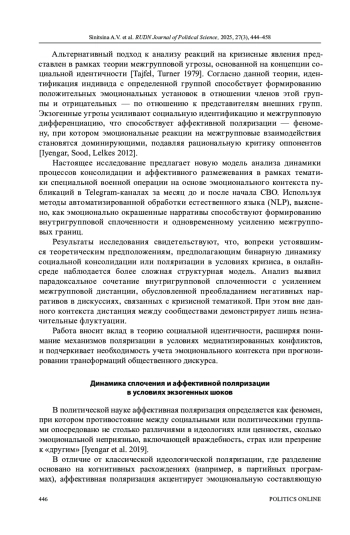 2. Синицина А.В. Измерение и моделирование эффекта сплочения в русскоязычных социальных медиа после начала СВО: анализ социальных мотиваций // Политическая наука. 2025. № 1. С. 203-218. http://www.;. DOI: 10.31249/poln/2025.01.09 EDN: CQVNAE