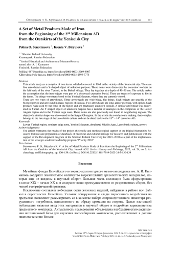 В научный оборот вводится комплекс железных предметов, найденных в окрестностях Енисейска, на территории пос. Байкал, и хранящихся в фондах Енисейского музея-заповедника им. А. И. Кытманова. В комплекс входят железное Y-образное изделие и пять разнотипных наконечников стрел. Среди последних присутствуют широкие плоские срезни монгольского времени и длинные бронебойные стрелы с шипами, характерные для таежного населения региона. На большинстве вещей наблюдаются следы окалины. Набор предметов позволяет предполагать, что здесь в ходе земляных работ было разрушено погребение по обряду трупосожжения на стороне. Комплекс относится к позднему этапу лесосибирской культуры и может быть датирован XIII–XIV вв.