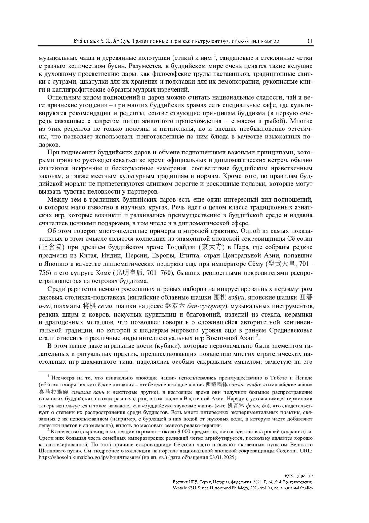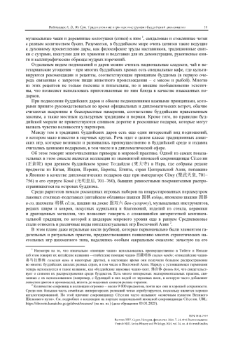 В общемировой религиозной буддийской традиции независимо от направлений и школ с давних пор принято обмениваться дарами в знак уважения и добрых намерений. Важными символическими дарами при установлении отношений между буддийскими общинами или организациями как на официальном уровне, так и на уровне личных контактов выступают предметы искусства, религиозные атрибуты – чаши, светильники, благовония и курильницы, сладости, чай и вегетарианские блюда, мандалы и буддийские статуэтки. В этом контексте как оригинальные виды дипломатических подарков в Восточной Азии рассмотрены традиционные шашечные и шахматные игры. Через краткий экскурс в историю развития азиатских стратегических игр на доске рассмотрена тесная связь шахматных игр с гадательной и религиозной деятельностью. Особенности шахматных игр целесообразно рассматривать на фоне деятельности буддийских храмов, выполнявших роль идеологических и культурных центров, во многом сохраняющих свой образовательный и духовный статус и поныне. Буддийская символика основных шахматных фигур и комбинаций проанализирована в контексте развития идеи об изменчивости и бренности мира, где каждое решение может привести к новой реальности. Шахматные игры могут выступить в качестве ценного дипломатического подарка, поскольку представляяют собой элегантный способ выстроить заинтересованный диалог сторон через культуру и традиции.