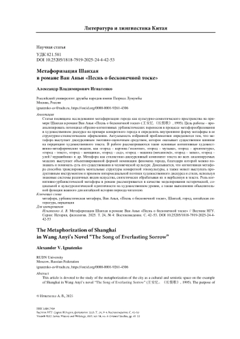 Статья посвящена исследованию метафоризации города как культурно-семиотического пространства на примере Шанхая в романе Ван Аньи «Песнь о бесконечной тоске» (王安忆 《长恨歌》, 1995). Цель работы – проанализировать потенциал образно-когнитивных урбанистических переносов в процессе метафорообразования в художественном дискурсе на примере конкретного города и определить внутреннюю форму метафоры в ее структурно-стилистическом оформлении. Актуальность избранной проблематики определяется тем, что метафора выступает дискурсивным эмотивно-оценочным средством, которое оказывает существенное влияние на перцепцию художественного текста. В работе рассматриваются такие основные когнитивные художественно-метафорические модели, как «город – картина / полотно», «город – музыка», «город – архитектура», «город – текст», «город – женщина», «город – сад», «город – машина (механизм)», «город – запах», «город – улей / муравейник» и др. Метафора как стилистико-дискурсивный компонент текста во всех анализируемых моделях выступает объективированной формой номинации феномена города, благодаря которой можно познавать и понимать суть его существования в человеческой культуре. Доказывается, что когнитивная метафора способна транслировать ментальные структуры конкретной этнокультуры, а также может выступать продуктивным инструментом и приемом интермедиальной поэтики художественного дискурса и стиля, используя знаковые системы различных видов искусства, синтетически обрабатывая их и вербализуя в тексте. Роль когнитивно-урбанистической метафоры в романе рассматривается в качестве моделирования исторической, социальной и культурологической идентичности на художественном уровне, а также выполнения объяснительной функции важного для китайской истории периода читателю.