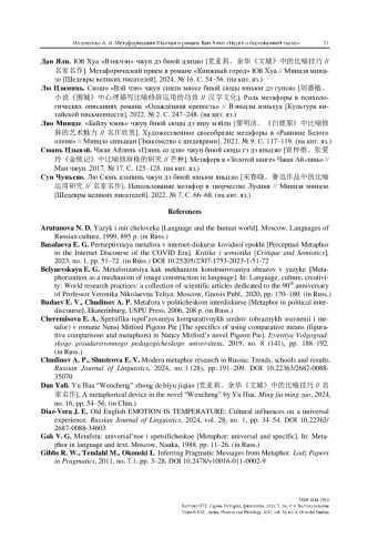 23. Лю Цзяминь. Сяошо «Вэй чэн» чжун синли мяосе биюй сюцы юньюн дэ гунсяо [刘嘉敏。 小说《围城》中心理描写比喻修辞运用的功效 // 汉字文化]. Роль метафоры в психологических описаниях романа «Осаждённая крепость» // Вэньцзы вэньхуа [Культура китайской письменности]. 2022. № 2. С. 247-248. (на кит. яз.)