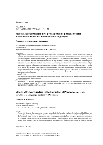Проводится описание и сопоставление метафорических концептов, лежащих в основе системной и дискурсивной фразеологии китайского языка. Целью данного исследовании является обсуждение принципов выделения устойчивых сверхсловных единиц и их классификации в китайской лингвистической традиции. Показано, что китайские лингвисты стремятся объединить структурные и семантические основания классификации, в результате чего границы выделяемых классов устойчивых словосочетаний становятся размытыми. Предпринимается попытка разграничить разные типы китайских фразеологизмов. Анализируются модели метафоризации и наиболее частотные метафорические концепты, формирующие фразеологические образы в китайском языке. Проводится сопоставление метафорических моделей формирования фразеологизмов в языке и кинодискурсе (жанр комедии). Проведенный анализ на материале лексикографических источников и комедийного кинодискурса в китайском языке позволил установить специфику характерных для китайского языка метафорических концептов.
