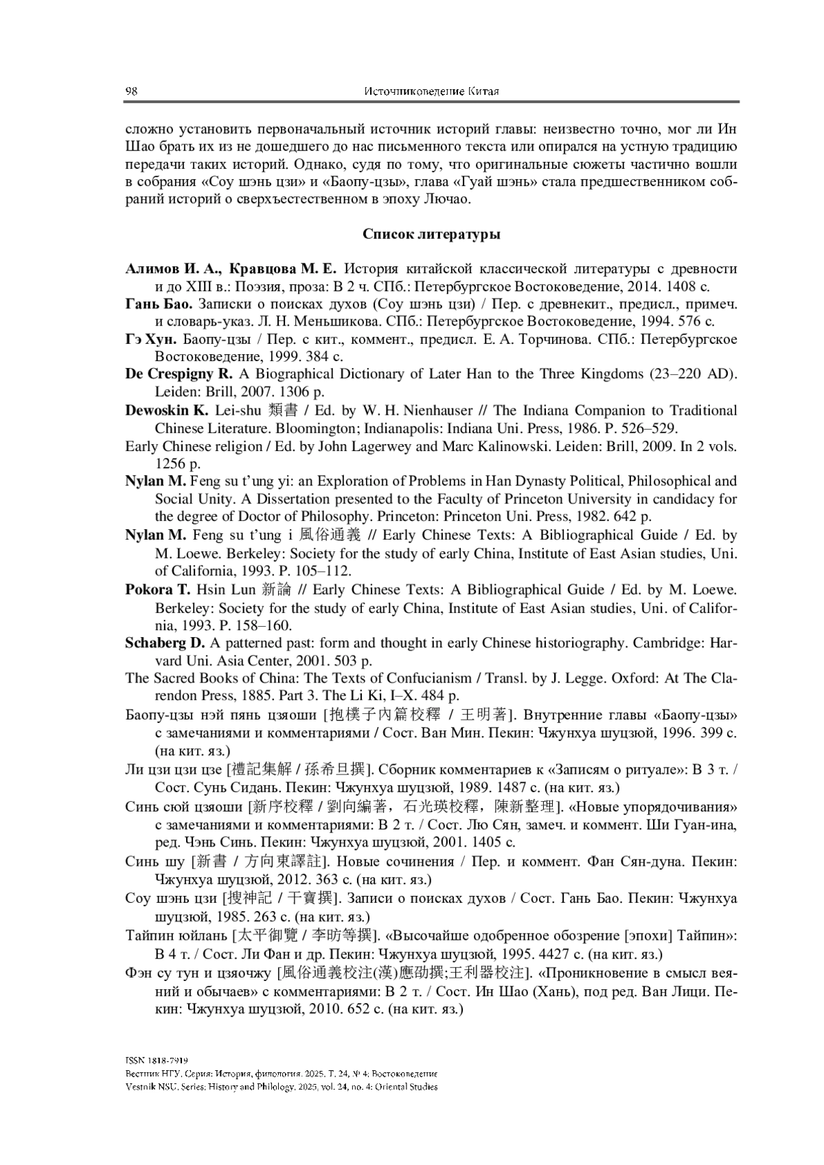2. Гань Бао. Записки о поисках духов (Соу шэнь цзи) / Пер. с древнекит., предисл., примеч. и словарь-указ. Л. Н. Меньшикова. СПб.: Петербургское Востоковедение, 1994. 576 с.