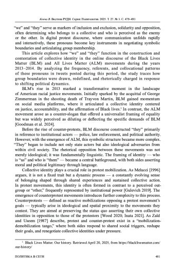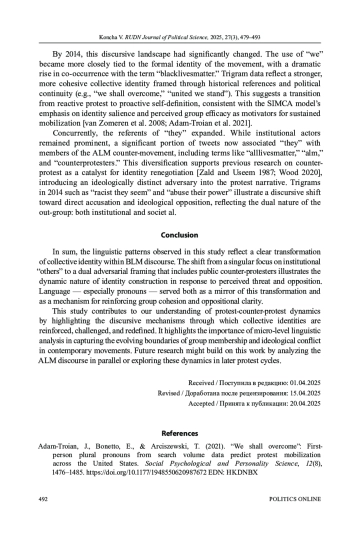 Трансформация коллективной идентичности в цифровом протестном дискурсе может фиксироваться с помощью отслеживания употребления местоимений первых и третьих лиц во множественном числе. Основываясь на теории коллективной идентичности и дискурсивном подходе, автор анализирует выборку из 100 000 твитов, опубликованных в период с июля 2013 г. по декабрь 2014 г., чтобы проследить использование местоимений «мы» и «они» до и после появления контрпротестного движения All Lives Matter. С применением триграммного коллокационного анализа и расчёта PMI (информационной взаимной значимости) выявляется переход от разрозненной и морально окрашенной внутригрупповой коллективной идентичности в 2013 г. к более устойчивой и политически оформленной идентичности в 2014 г. Одновременно изменяется и образ «других»: если в 2013 г. он был представлен преимущественно государственными институтами (например, полицией), то в 2014 г. он дополняется идеологическими оппонентами из гражданского общества. Полученные результаты подтверждают гипотезу о том, что появление контрпротестов изменило дискурсивные границы оппозиции, усилив поляризацию и дуализм в структуре коллективной идентичности. Работа вносит вклад в изучение взаимодействия протестов и контрпротестов, выявляя лингвистические механизмы формирования, оспаривания и перестройки групповой идентичности в условиях идеологического противостояния.