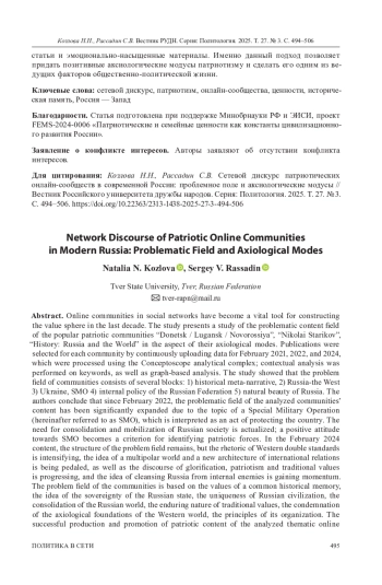 Онлайн-сообщества в социальных сетях в последнее десятилетие стали важнейшим инструментом конструирования ценностной сферы. Представлено исследование проблемного поля контента популярных патриотических сообществ в социальной сети «ВКонтакте» - «Донецк / Луганск / Новороссия», «Николай Стариков», «История: Россия и мир» в аспекте их аксиологических модусов. Для каждого сообщества были выбраны публикации путем сплошной выгрузки данных за февраль 2021, 2022, 2024 гг., которые подверглись обработке при помощи аналитического комплекса «Концептоскоп»; по ключевым словам проводился контекстный анализ, а также анализ на основе графов. Исследование показало, что проблемное поле сообществ состоит из нескольких блоков: 1) исторический метанарратив, 2) Россия - Запад, 3) Украина, СВО, 4) внутренняя политика РФ, 5) природные красоты России. Авторы приходят к выводу, что с февраля 2022 г. проблемное поле контентов анализируемых сообществ существенно расширяется за счет темы Специальной военной операции (СВО), которая трактуется как акт защиты страны; актуализируется необходимость консолидации и мобилизации российского общества; положительное отношение к СВО становится критерием идентификации патриотических сил. В контенте за февраль 2024 г. структура проблемного поля сохраняется, однако усиливается риторика двойных стандартов Запада, педалируется идея многополярного мира и новой архитектуры международных отношений, а также прогрессирует дискурс героизации, патриотизма и традиционных ценностей, набирает силу идея очищения России от внутренних врагов. Проблемное поле сообществ опирается на ценности общей исторической памяти, идеи суверенности российского государства, уникальности российской цивилизации, консолидации русского мира, непреходящего характера традиционных ценностей, осуждения аксиологических оснований западного мира и принципов его организации. Успешное производство и продвижение патриотического контента анализируемых тематических онлайн-сообществ определяется использованием комплексного подхода, сочетающего исторический нарратив и актуальный событийный ряд, аналитические статьи и эмоционально-насыщенные материалы. Именно данный подход позволяет придать позитивные аксиологические модусы патриотизму и сделать его одним из ведущих факторов общественно-политической жизни.
