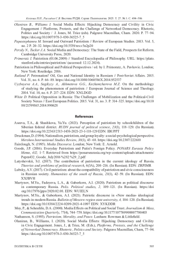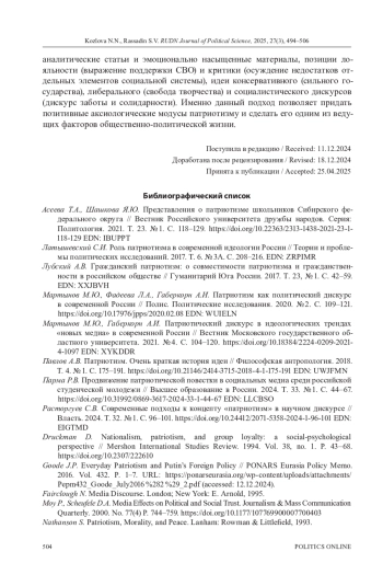4. Мартынов М.Ю., Фадеева Л.А., Габеркорн А.И. Патриотизм как политический дискурс в современной России // Полис. Политические исследования. 2020. № 2. С. 109-121. DOI: 10.17976/jpps/2020.02.08 EDN: WUIELN