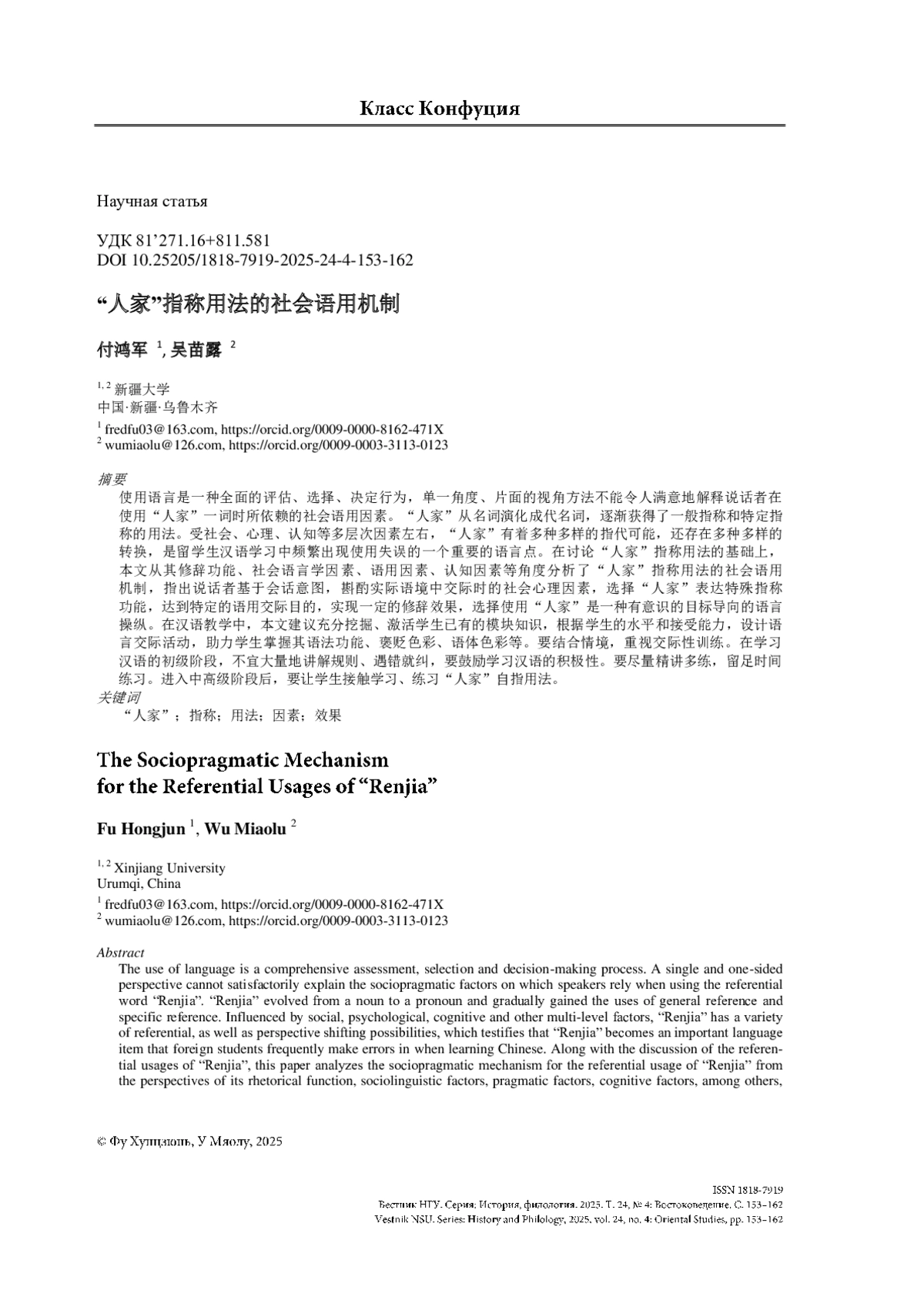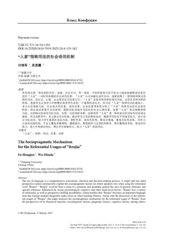 Выбор говорящим тех или иных лексических единиц обусловлен целостной оценкой ситуации, и социолингвистические факторы, которые учитывают говорящие при использовании слова «жэньцзя», не могут быть объяснены при одностороннем подходе. Существительное «жэньцзя» не только перешло в местоимение (проминализация), но и постепенно приобрело как общее, так и специфическое референтное употребление. В силу социальных, психологических и когнитивных факторов слово «жэньцзя» имеет широкий спектр возможных значений и разнообразных трансформаций, что ведет к частым ошибкам иностранцев, изучающих китайский язык. В данной статье анализируется социопрагматический механизм употребления «жэньцзя» с точки зрения его риторической функции, социолингвистических, прагматических и когнитивных факторов и указывается, что социолингвистические факторы говорящего основываются на разговорном намерении и фактическом контексте. Отмечается, что говорящий выбирает «жэньцзя» для выражения особой референциальной функции, исходя из разговорных намерений, учитывая социально-психологические факторы в реальном контексте, для достижения конкретной коммуникативной цели и определенного риторического эффекта и что выбор использования «жэньцзя» является сознательным целенаправленным языковым манипулированием. Чтобы помочь обучающимся овладеть грамматическими функциями, оценочной и стилистической окраской слова «жэньцзя», авторы предлагают опираться на уже имеющиеся у учащихся знания и разрабатывать коммуникативные задания в соответствии с их уровнем и возможностью усвоения материала. Необходимо задавать ситуативный контекст и отрабатывать употребление слова в разных коммуникативных ситуациях. На начальном этапе изучения китайского языка во избежание утраты мотивации обучающихся не рекомендуется вводить полный спектр значений и особенностей употребления и стремиться немедленно исправлять все ошибки обучающихся. Необходимо оставлять больше времени для практики. Изучать и практиковать использование «жэньцзя» в функции самореференции следует на среднем и продвинутом уровнях обучения.