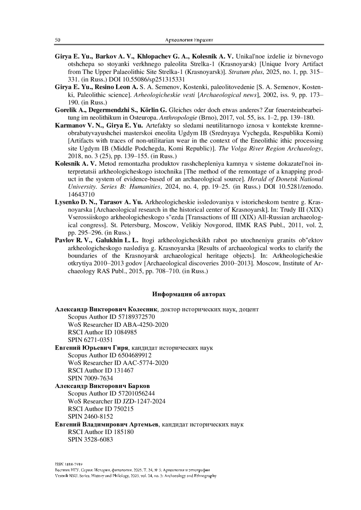 6. Гиря Е. Ю., Барков А. В., Хлопачев Г. А., Колесник А. В. Уникальное изделие из бивневого отщепа со стоянки верхнего палеолита Стрелка-1 (Красноярск) // Stratum plus. 2025. № 1. С. 315-331. https://doi.org/10.55086/sp251315331