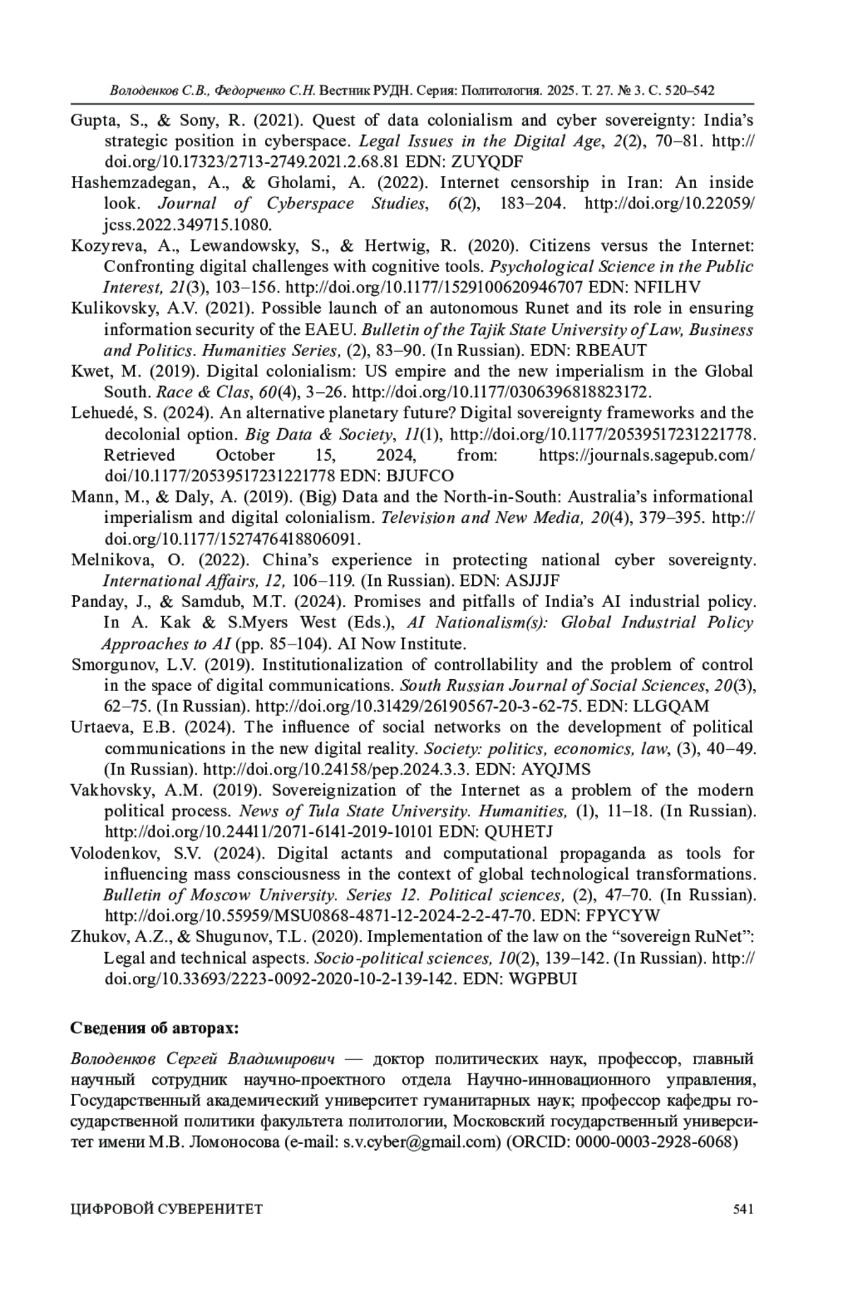 13. Gupta S., Sony R. Quest of Data Colonialism and Cyber Sovereignty: India’s Strategic Position in Cyberspace // Legal Issues in the Digital Age. 2021. Vol. 2, no. 2. P. 70-81. DOI: 10.17323/2713-2749.2021.2.68.81 EDN: ZUYQDF