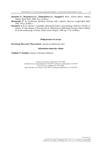 9. Мыльников В. П. Обработка дерева в скифское время на Монгольском Алтае // Молодин В. И., Парцингер Г., Цэвээндорж Д. и др. Замерзшие погребальные комплексы пазырыкской культуры на южных склонах Сайлюгема (Монгольский Алтай). М.: Триумф принт, 2012. С. 433-513.
