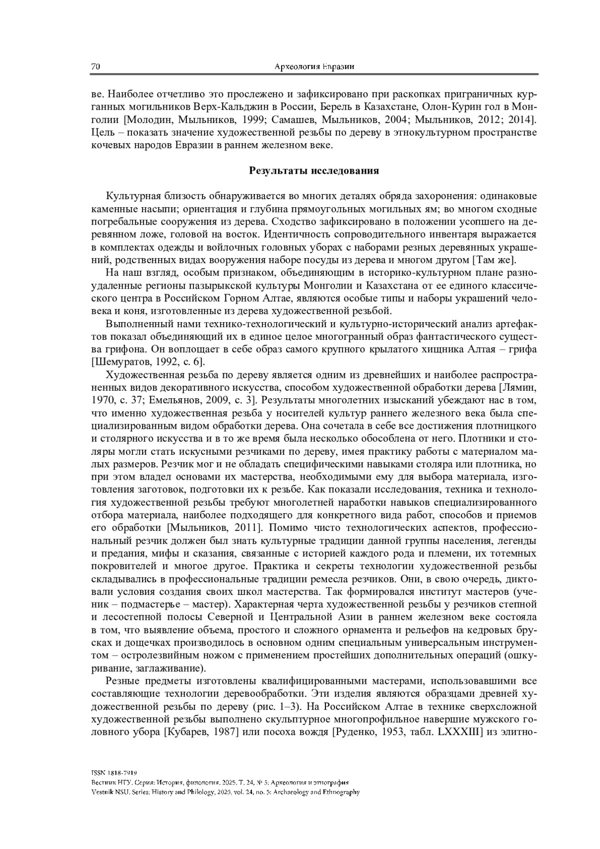 Проведен технико-технологический и сравнительно-культурный анализ отдельных исследованных археологических памятников скифского времени России, Казахстана и Монголии. Выявлено, что курганы пазырыкской культуры на могильниках Верх-Кальджин на Российском Алтае, Берель на Казахском Алтае и Олон-Курин гол на Монгольском Алтае имеют много общего. Сходство обнаружено во многих деталях погребального обряда: одинаковые каменные насыпи, ориентация и глубина прямоугольных могильных ям, во многом похожие погребальные сооружения из дерева, положение усопшего – на деревянном ложе, головой на восток. Идентичность сопроводительного инвентаря выражена в комплектах одежды и войлочных головных уборах с наборами резных деревянных украшений, аналогичных видах вооружения, наборе посуды из дерева. Особая близость проявлена в мотивах различных украшений коня и человека, выполненных из дерева, особенно в художественной резьбе. Абсолютное подобие прослежено при комплексном технико-технологическом и культурологическом анализе украшений конской узды сопроводительных коней, нагрудных блях, жезлов власти верховных вождей. В их видовом многообразии преобладают образы грифов.