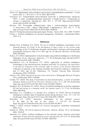 11. Тертышный В.А. Интеграция искусственного интеллекта в избирательный процесс как глобальный тренд: правовой аспект // Интеллектуальные ресурсы - региональному развитию. 2024. № 1. С. 154-160. EDN: BGHTMQ