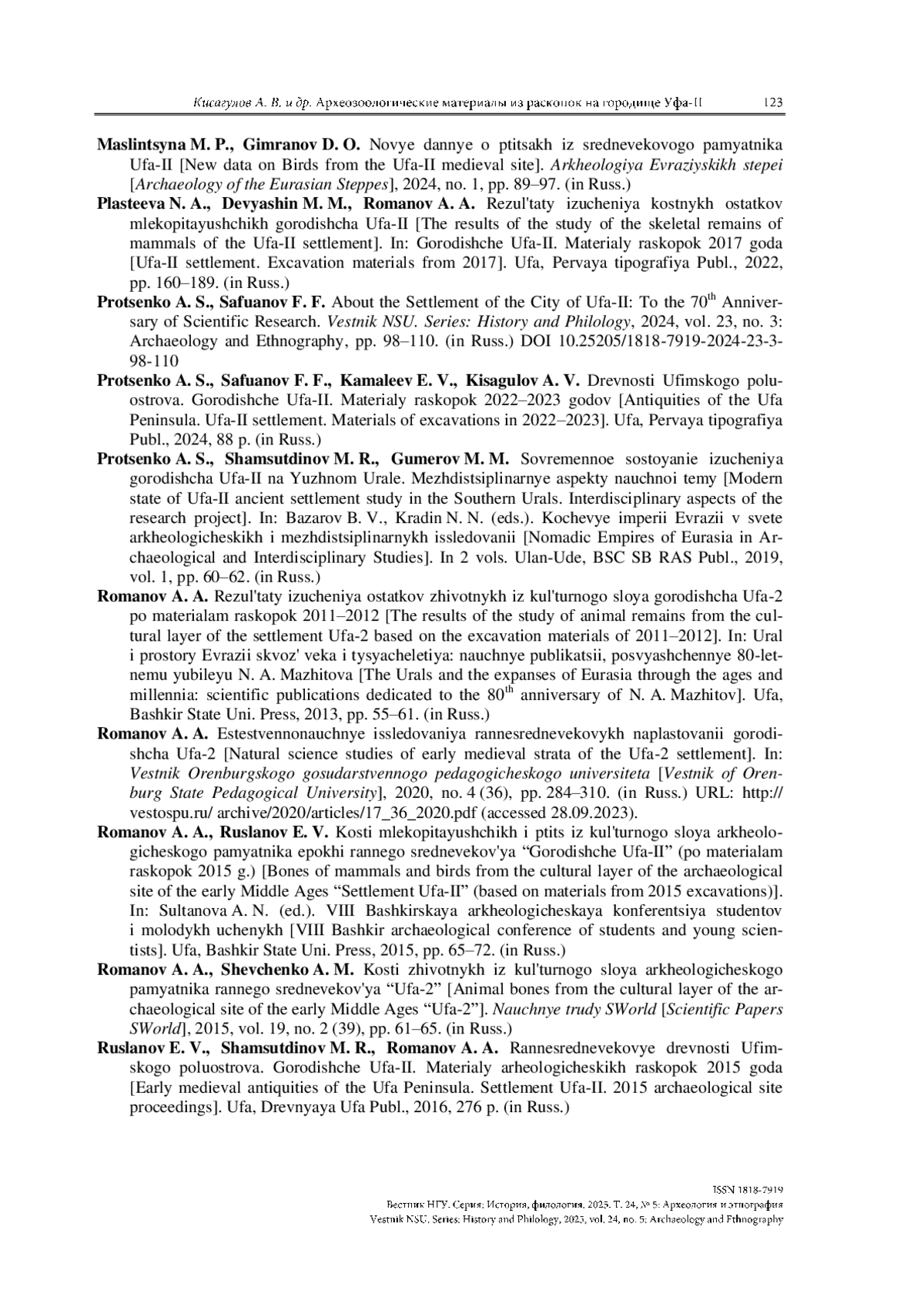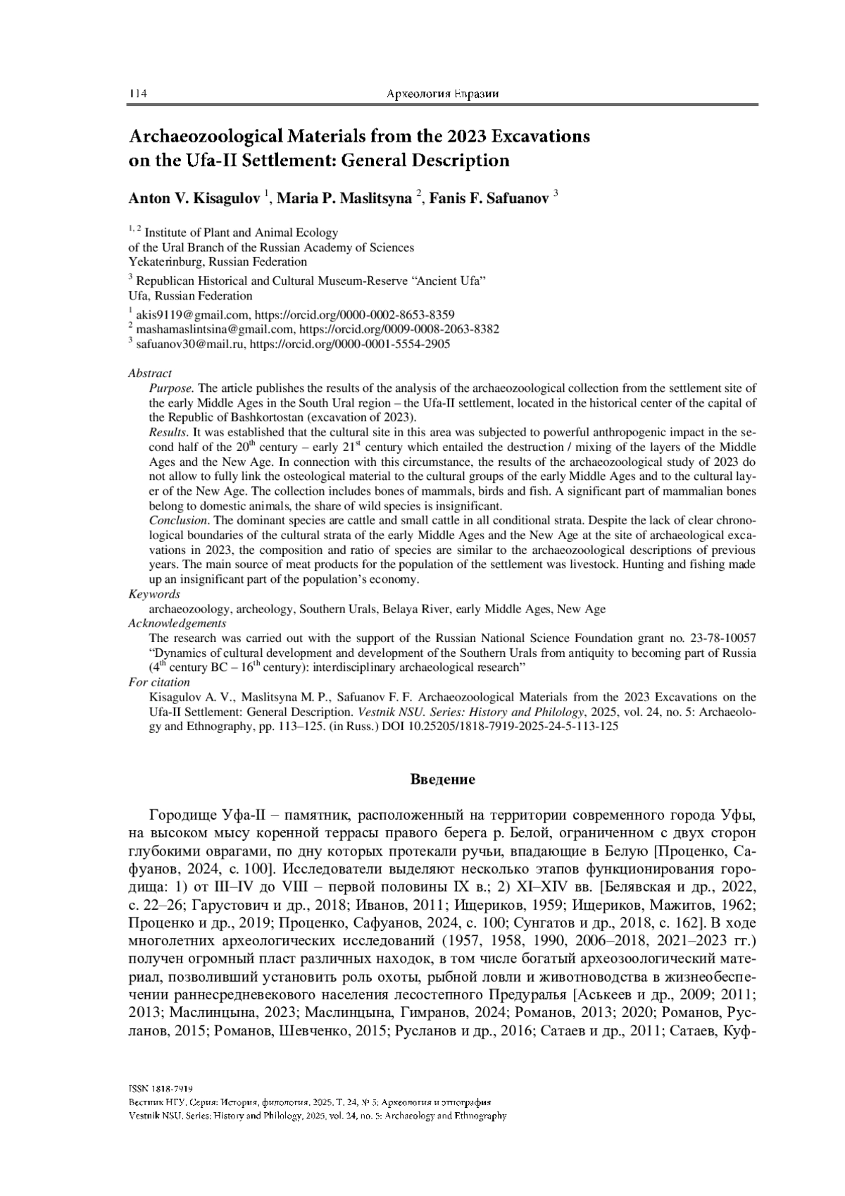 Публикуются результаты анализа археозоологической коллекции, собранной в ходе раскопок поселенческого памятника эпохи раннего Средневековья городища Уфа-II в 2023 г. Исследования проходили на локальном участке в юго-западной части памятника. В ходе работ было установлено, что культурный слой на данном участке подвергся мощному антропогенному воздействию во второй половине XX в. – начале XXI в., повлекшему за собой уничтожение / смешение слоев эпохи Средневековья и Нового времени. В связи с данным обстоятельством, результаты археозоологического исследования 2023 г. не позволяют в полной мере привязать остеологический материал к культурным группам раннего Средневековья и Нового времени. В коллекции присутствовали кости млекопитающих, птиц и рыб. Части костей млекопитающих принадлежат в основном домашним животным, доля диких видов незначительна.