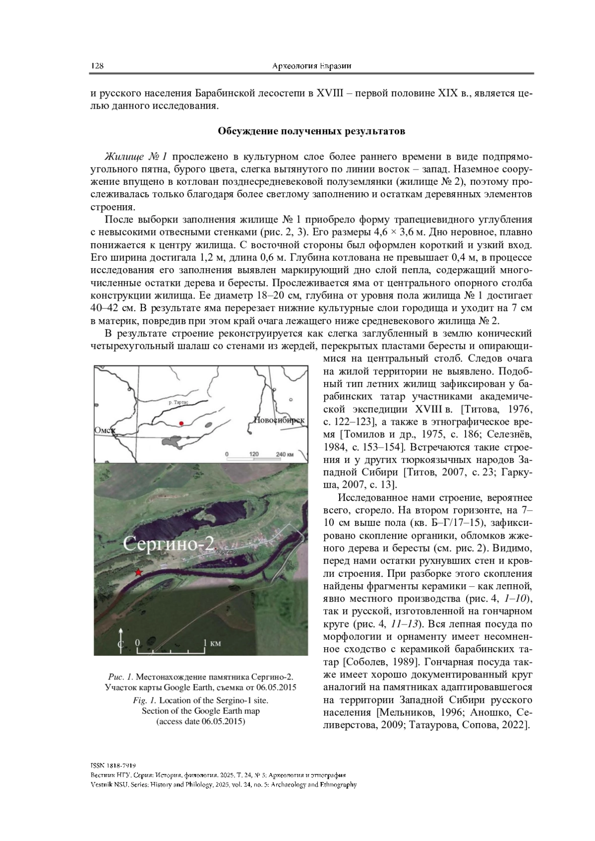 Представлена публикация материалов комплекса сооружений барабинских татар, состоящего из наземного жилища и двух хозяйственных ям. Памятник обнаружен на территории городища эпохи раннего железа Сергино-2; расположенного на правом берегу р. Оми у с. Сергино Чановского района Новосибирской области. Жилище представляет собой летнюю постройку в виде покрытого берестой и дерном шалаша. Найдены железные ножи; долото; скальпель; гвозди; фрагмент стеклянного флакона и ружейный кремень. Основная часть этих предметов имеет широкий круг аналогий в позднесредневековых и русских памятниках Сибири и европейской части России. Керамический комплекс памятника состоит из лепных сосудов барабинских татар и русской станковой керамики. Кости животных от остатков пищи указывают на развитое скотоводство. Памятник демонстрирует взаимодействие аборигенного и русского населения Барабинской лесостепи в XVIII – первой половине XIX в.