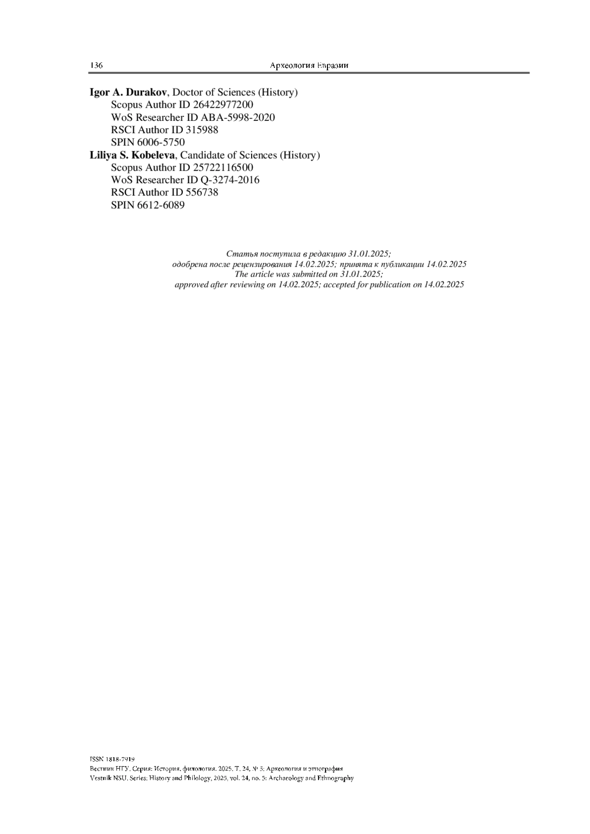 10. Мыльникова Л. Н., Молодин В. И., Дураков И. А., Ненахов Д. А., Ефремова Н. С., Кравцова А. С., Кобелева Л. С., Ненахова Ю. Н., Васильев С. К. Следы деятельности бугровщиков на элитном кургане 7 раннего железного века могильника Тартас-2 (Барабинская лесостепь) // Проблемы археологии, этнографии, антропологии Сибири и сопредельных территорий. Новосибирск: Изд-во ИАЭТ СО РАН, 2024. Т. 30. С. 629-636.