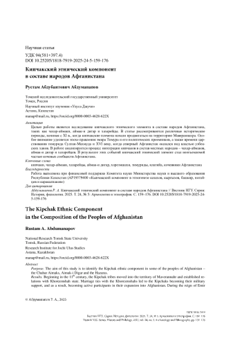 Целью работы является исследование кипчакского этнического элемента в составе народов Афганистана, таких как чахар-аймаки, аймак-и дигар и хазарейцы. В статье рассматриваются различные исторические периоды, начиная с XI в., когда кипчакские племена начали продвигаться на территорию Мавераннахра. Особое внимание уделяется эпохе правления эмира Тимура и его политических преемников, а также времени царствования тимурида Султан-Махмуда и XVI веку, когда северный Афганистан оказался под властью узбекских ханов. В работе анализируется процесс интеграции кипчаков в состав местных народов – чахар-аймаков, аймак-и дигар и хазарейцев. В результате этих событий кипчакский этнический элемент стал неотъемлемой частью кочевых сообществ Афганистана.