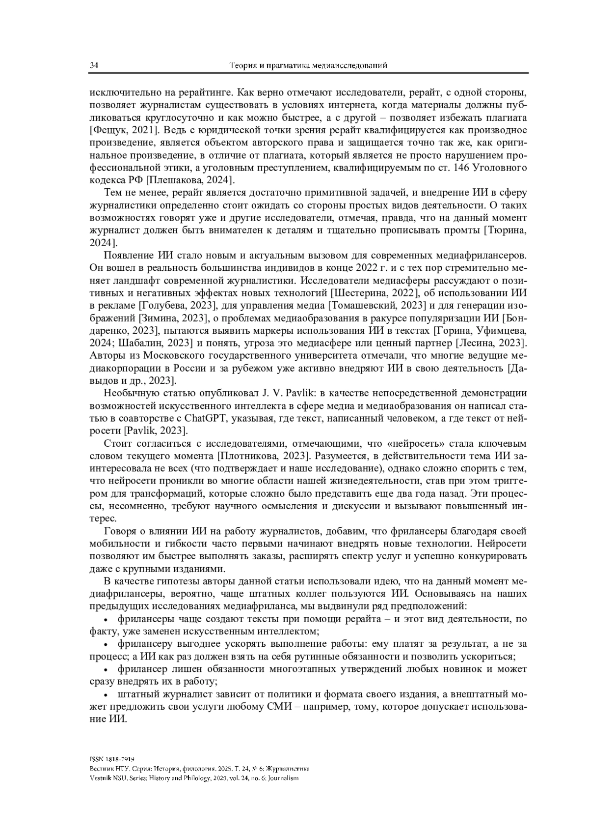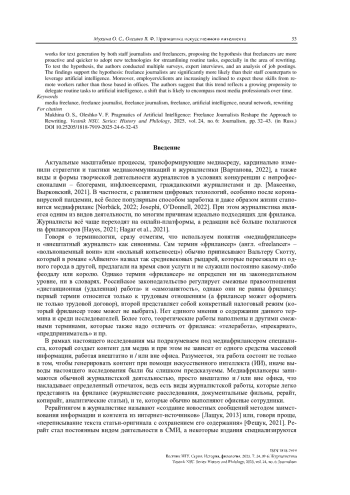 Процесс цифровизации меняет стратегии медиакоммуникаций и журналистики. В конце 2022 г. медиасфера столкнулась с новым вызовом – развитием и популяризацией искусственного интеллекта. В настоящей статье авторы решили сравнить использование нейросетей для генерации текстов штатными журналистами и медиафрилансерами, предположив, что последние активнее и быстрее начинают внедрять новые технологии для трансформации рутинных процессов, в частности рерайта. Для проверки гипотезы было проведено несколько опросов, экспертных интервью, а также проанализирован сайт вакансий. Гипотеза подтвердилась: внештатные авторы значительно чаще своих штатных коллег используют искусственный интеллект, а работодатели / заказчики чаще ожидают таких навыков от удаленных сотрудников, чем от офисных. Авторы предполагают, что данный процесс постепенно охватит большинство представителей медиасферы.