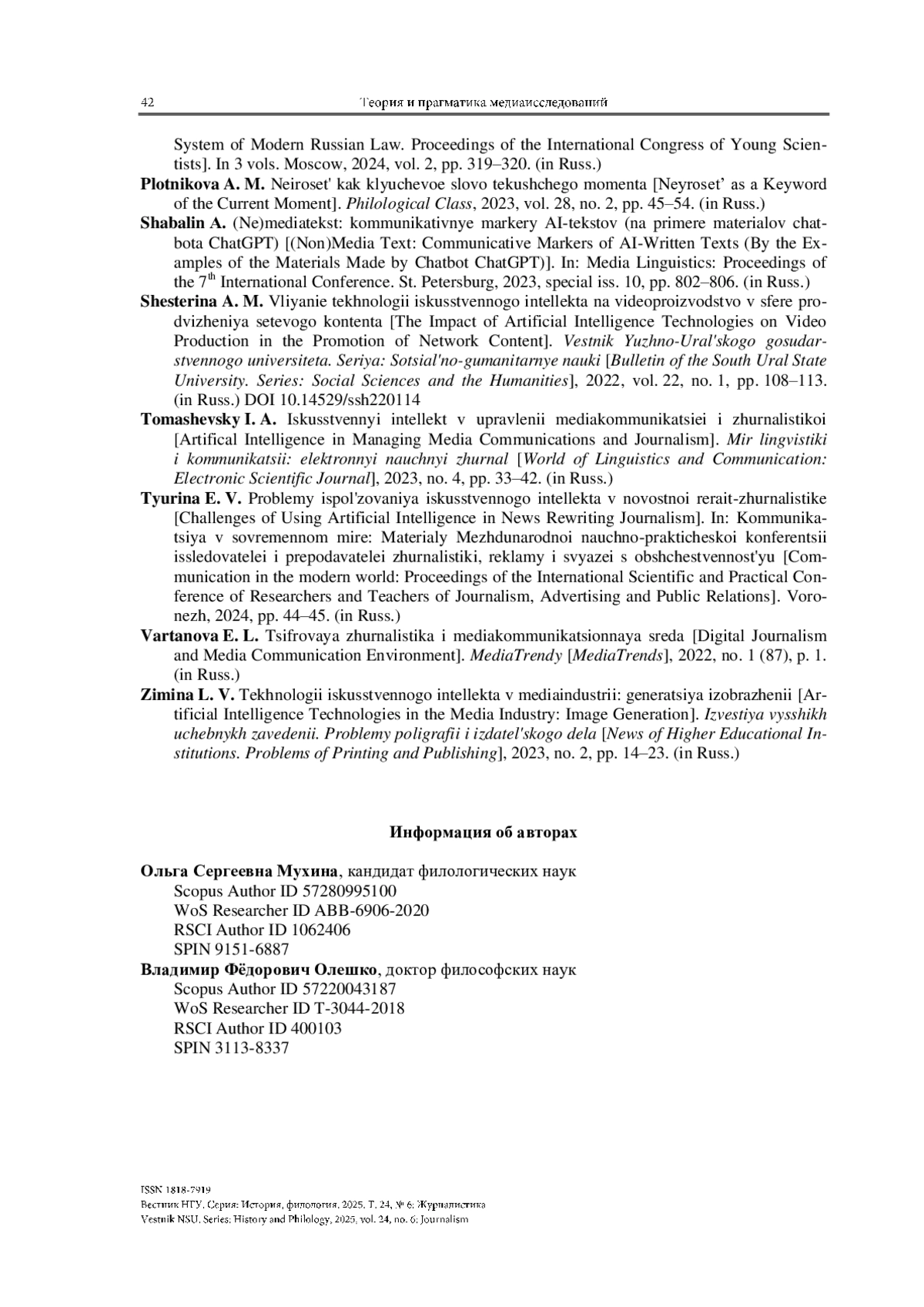 1. Бондаренко Е. А. Искусственный интеллект и проблемы медиаобразования // Медиа. Информация. Коммуникация. 2023. Т. 37, № 2. С. 7-12. Вартанова Е. Л. Цифровая журналистика и медиакоммуникационная среда // МедиаТренды. 2022. № 1 (87). С. 1.